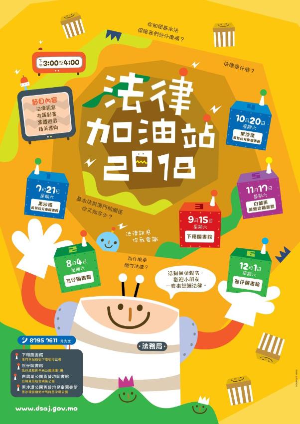 除了11月17日外,本年度最後一場“法律加油站”亦將於12月1日(於氹仔圖書館)舉行,時間同樣是下午3時至4時。活動無須報名,歡迎各位家長及小朋友踴躍參與,查詢活動請致電87957611(馬先生)。