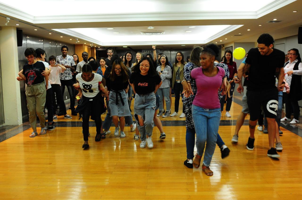 活動之一“中外學生結語伴”在理工致遠樓大堂舉行,吸引了近百名中外學生參加。舉行活動前的數周,各班班長在老師做好了充分籌備,建立微信群集思廣益,確定活動程式、活動專案及主持人。活動當日,中外同學按分組,在一年級國際漢語教育母語班學生的集體詩朗誦後,隨即開始了各項結語伴活動。現場氣氛歡樂和諧,這些趣味活動吸引了各組同學一次又一次相互挑戰,如中文接力葡語傳遞號碼、中文解說國際學生動作呈現、二人合作徒手運送氣球等,參與學生還三兩成對結成語伴一起交流,踴躍互動。