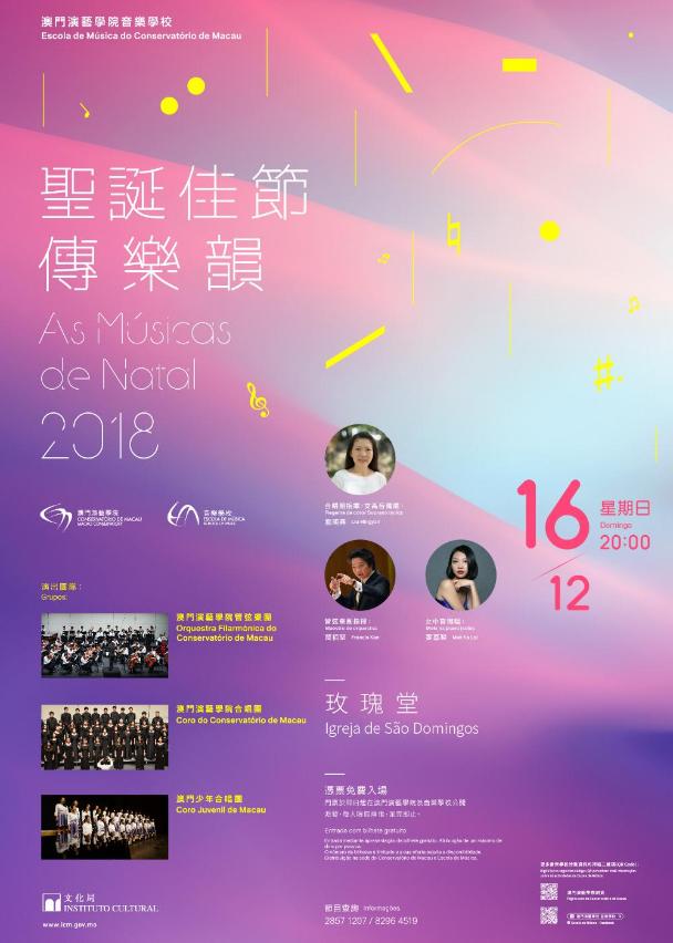 文化局澳門演藝學院音樂學校將於12月16日(星期日)晚上8時假玫瑰堂舉行《聖誕佳節傳樂韻2018》音樂會,當日將獻上一場悅耳動聽的聖誕音樂盛宴,與市民一起迎接聖誕佳節的來臨。