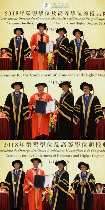 澳門大學今(1)日舉行“2018年榮譽學位及高等學位頒授典禮",向沈祖堯教授、劉少榮博士、劉藝良先生頒授榮譽博士學位,以表彰他們的卓越成就、為社會發展和教育做出的重大貢獻。