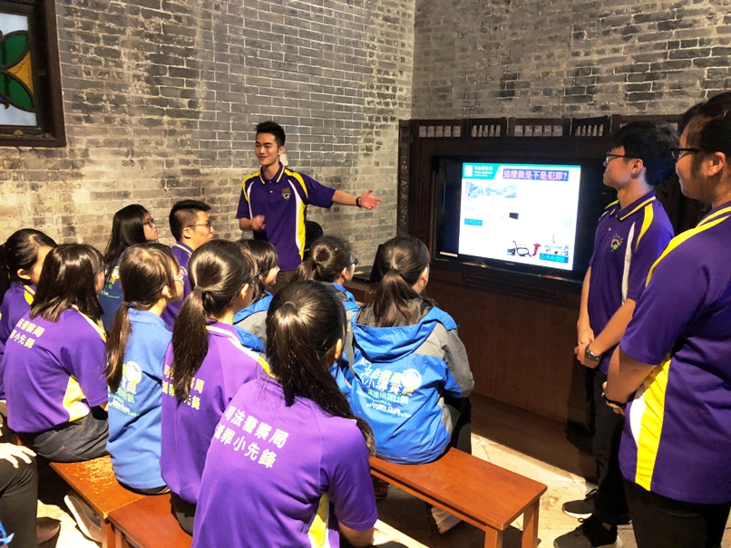 參觀活動結束後,滅罪小先鋒學員與小小導賞員進行互動交流。滅罪小先鋒學員分享了在司警局所學到的防罪知識和技巧,並特別介紹了有關刑事毀損犯罪的法律規定、毀壞文化遺產的處罰,以及有關行為須承擔的法律責任等法律知識。小小導賞員亦分享了參與導賞員實踐培訓計劃的心得和體會。