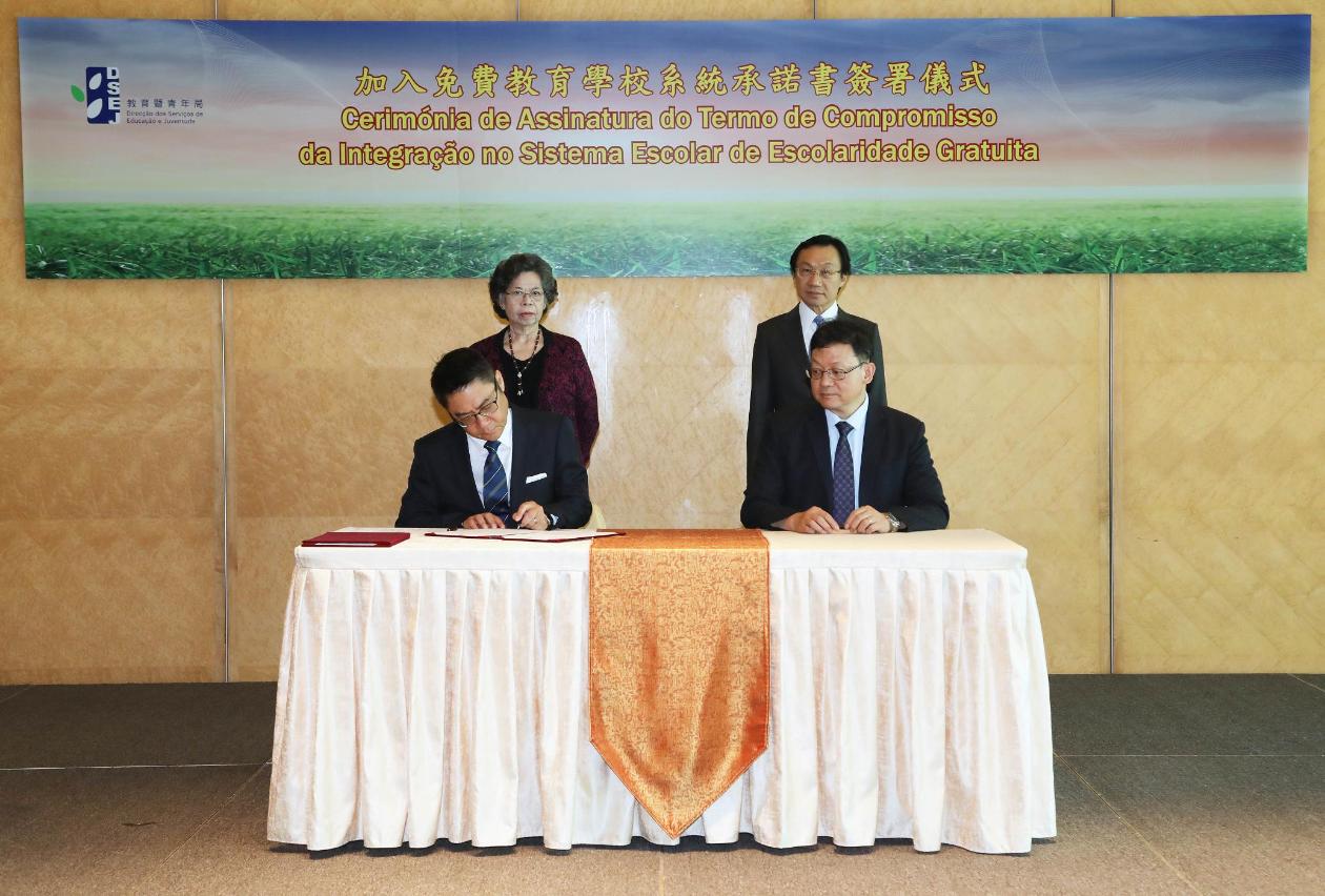 非高等教育委員會和青年事務委員會於12月5日上午十時三十分假旅遊塔舉行聯合座談會。會議由兩個委員會的主席、社會文化司司長譚俊榮主持。會議進行前,在譚俊榮司長及澳門土生教育協進會諮詢委員會委員施綺蓮的見證下,教育暨青年局局長老柏生與該會管理委員會主席飛文基簽署了魯彌士主教幼稚園加入免費教育學校系統的承諾書。