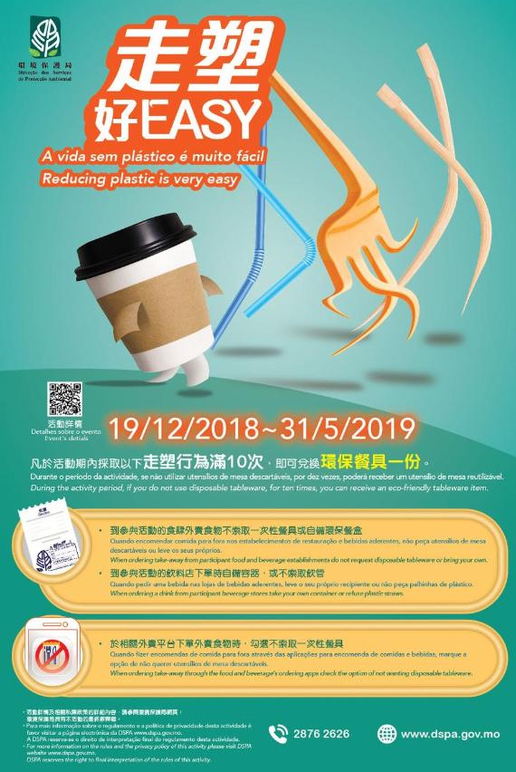 活動期由2018年12月19日至2019年5月31日,市民可於活動期內採取以下任一“走塑”行為,包括:一、到參與活動的食肆(不包括飲料店)購買外賣食物時,不索取一次性餐具(包括筷子、叉、匙等)或自備環保餐盒;二、到參與活動的飲料店購買飲料時自備容器或不索取飲管;三、於相關外賣平台下單外賣食物時,勾選不索取一次性餐具之相關選項。累積參與滿十次,即可憑紀錄於2019年6月30日或之前於辦公時間內到環境保護局(地址:澳門馬交石炮台馬路32號至36號電力公司大樓一樓)換領環保餐具一份(需提供有關食肆加蓋指定印章的單據,或出示相關外賣平台的消費紀錄或截圖,每人限兌換一次)。