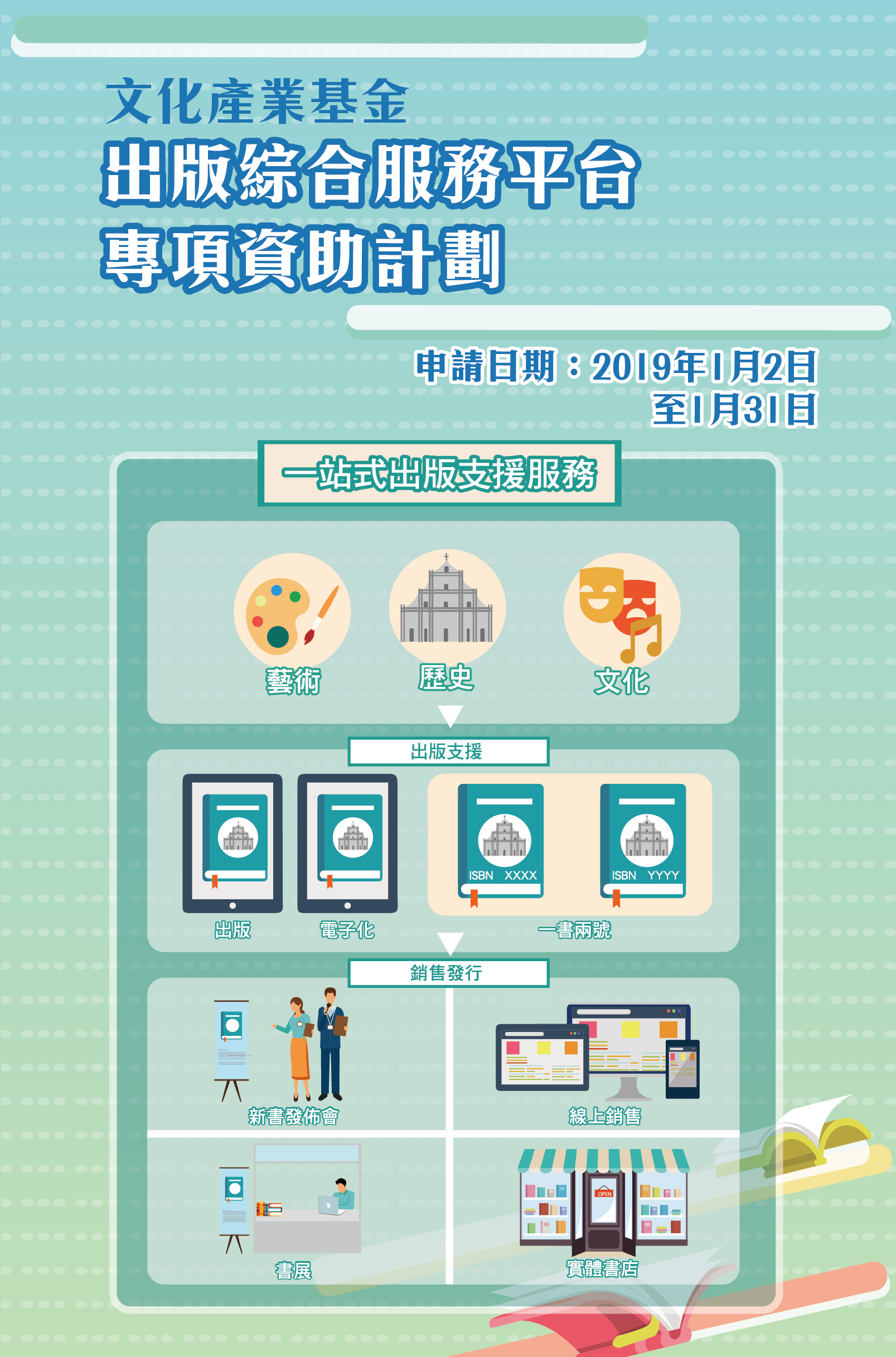兩個服務平台,分別是出版綜合服務平台及影視綜合服務平台的專項資助計劃申請期均是1月2日至1月31日。出版綜合服務平台專項資助計劃為澳門藝術、歷史及文化的書籍出版提供一站式支援服務,包括出版紙本及電子書籍,為書籍申請一書兩號、舉行新書發佈會、參加書展、於線上銷售及在實體書店上架等。項目執行期24個月,資助名額一個,資助額上限500萬澳門元,以實報實銷形式資助。