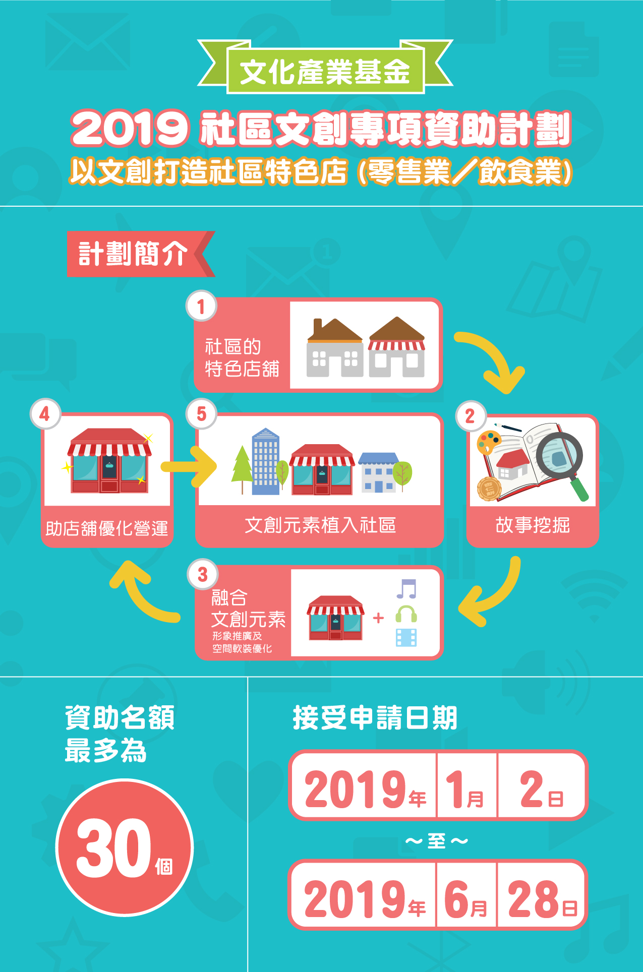 2019年的社區文創專項資助計劃申請期由1月2日至6月28日,須由文創企業與特色店舖共同申請,文創企業在澳門設立不少於3年,特色店舖在澳門營運不少於8年,且是在獨立商用空間經營的零售業或飲食業特色店舖。資助名額最多30個,資助額為文創企業上限10萬澳門元,用於構建及統籌費用,特色店舖項目實施費用實際支出的50%,上限20萬澳門元。