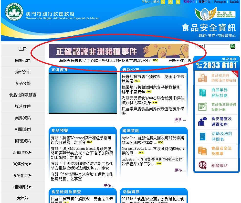 市政署會持續關注非洲豬瘟疫情的發展,與內地及鄰近地區相關部門繼續保持著密切的溝通與聯繫,並適時作出應對處理及公佈有關訊息。市民亦可留意市政署網頁www.iam.gov.mo或市政署食品安全資訊網www.foodsafety.gov.mo及食安資訊手機應用程式,了解最新情況及認識非洲豬瘟的資訊。