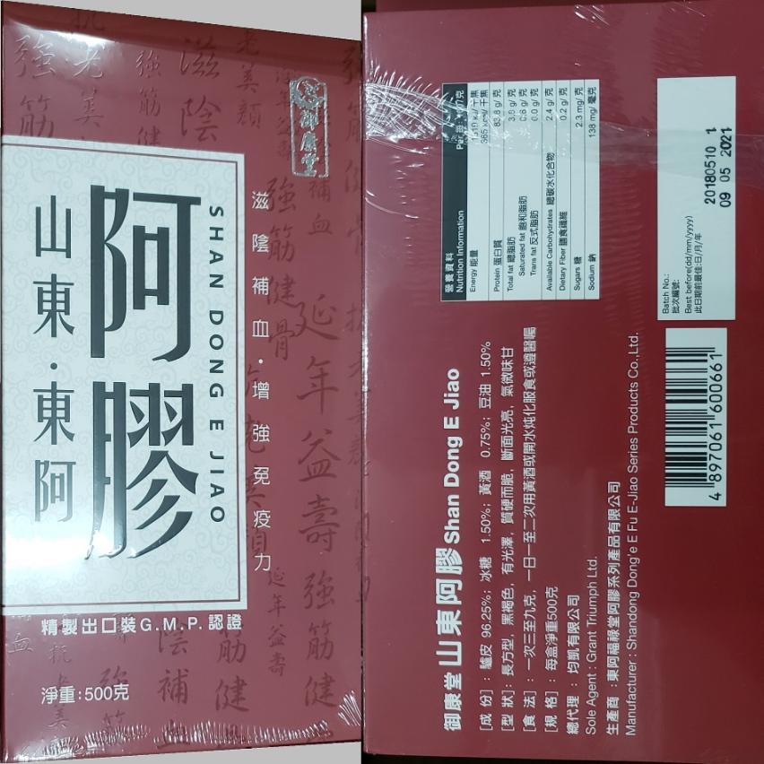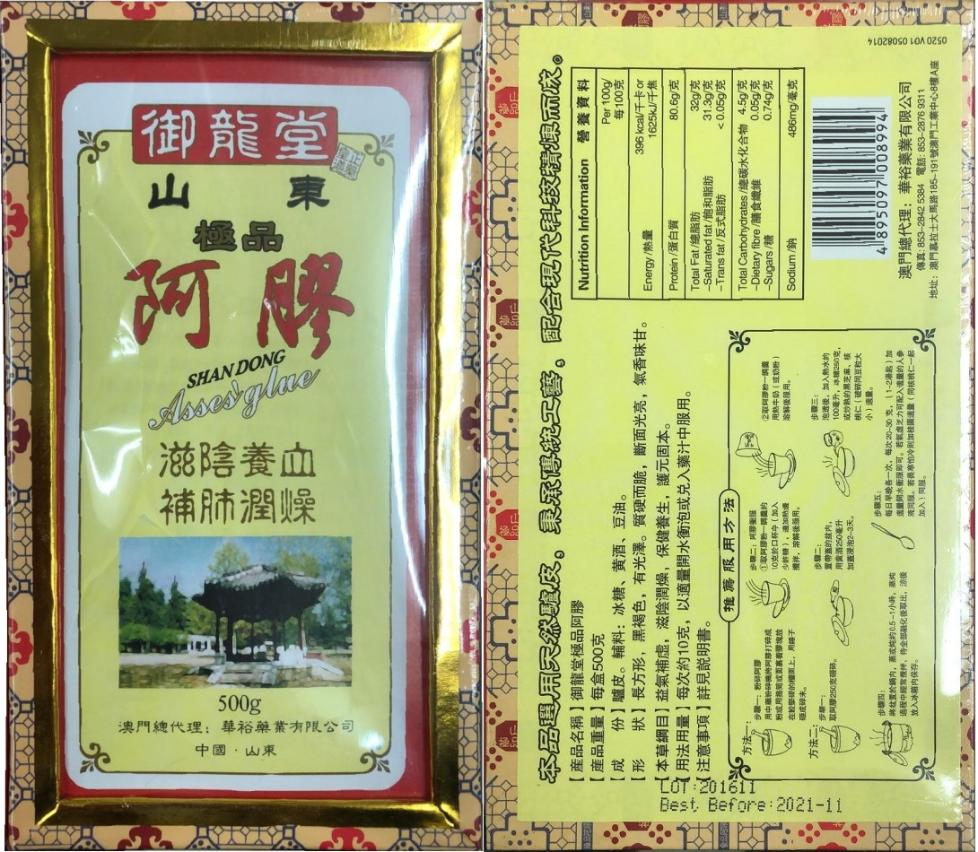 “阿膠”是由驢皮煎煮濃縮製成的產品,屬於澳門特區所用中藥材表第II部份的普通中藥材,功效為補血滋陰、潤燥、止血。根據國家標準,“阿膠”不能摻有驢皮以外的動物成分,為保障公眾健康,衛生局指令中藥房及有關的藥物出入口及批發商回收上述中藥材,並呼籲巿民停止使用,而相關的藥物出入口及批發商亦同意自願回收所有批次的上述產品。居民如有疑問,可於辦公時間致電85983427向衛生局藥物事務廳查詢。