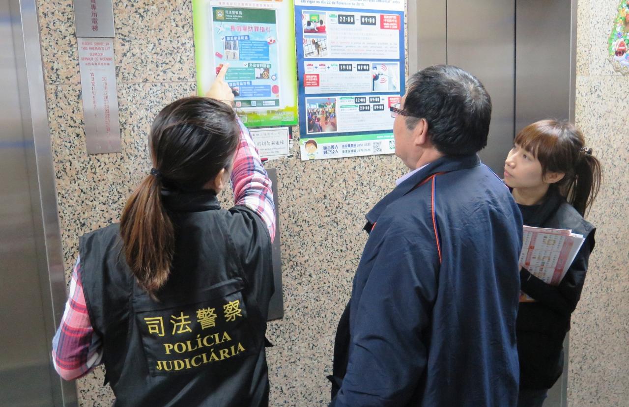 去年11月下旬至12月期間,司警局人員分別走訪本澳各社團、機構、學校、社區中心、長者中心、商舖及住宅大廈等進行冬防宣傳,向社團機構代表、市民及商戶收集社區最新的治安資訊,並提醒他們年近歲晚,須做好各項防罪措施,尤其要防範盜竊、詐騙等侵財案件發生。