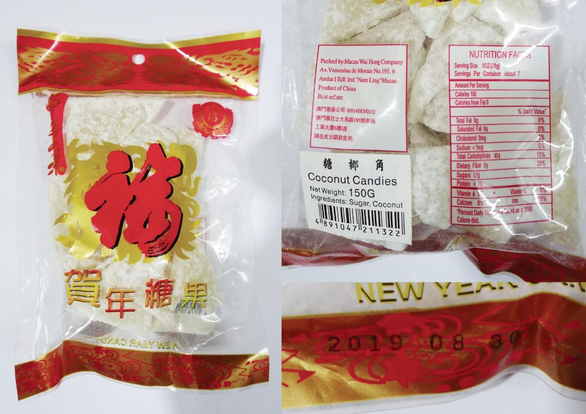特區政府透過時令食品檢測抽樣監察,於各零售點抽取賀年食品樣本進行微生物及化學檢測。根據檢測結果,有一預包裝糖椰角樣本檢出含百萬分之一千二百九十的二氧化硫,該產品抽取自祐漢區一超級市場的“信”牌糖椰角,每包裝淨重150克,標示之食用期限為2019年8月30日,供應商為澳門惠康公司。針對上述不合格樣本,當局已即時通知涉事商戶檢測結果,要求有關店舖即時停售及回收問題產品,並追查產品的來源和分銷情況。巿政署食品安全廳亦同時發出食品預警,通知供應商及零售商停售受影響批次的產品。