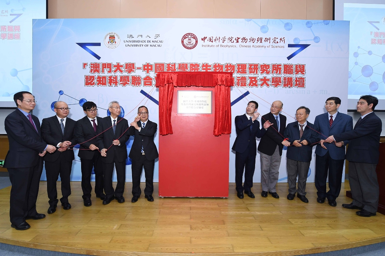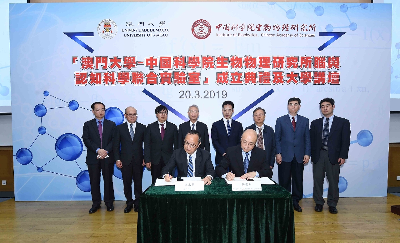 澳大校長宋永華及中科院生物物理研究所所長許瑞明簽署“澳門大學—中國科學院生物物理研究所腦與認知科學聯合實驗室”合作協議。出席簽約儀式的嘉賓有中央人民政府駐澳門特別行政區聯絡辦公室秘書長王新東、澳大校董會主席林金城、中國科學院生物物理研究所院士陳霖、澳門科學技術發展基金行政委員會主席馬志毅、中國科學院生物物理研究所研究員張先恩、中國科學院生物物理研究所研究員兼腦與認知科學國家重點實驗室主任何生、澳門高等教育局代局長曾冠雄、澳大副校長(研究)葛偉。同場還為實驗室進行揭牌。