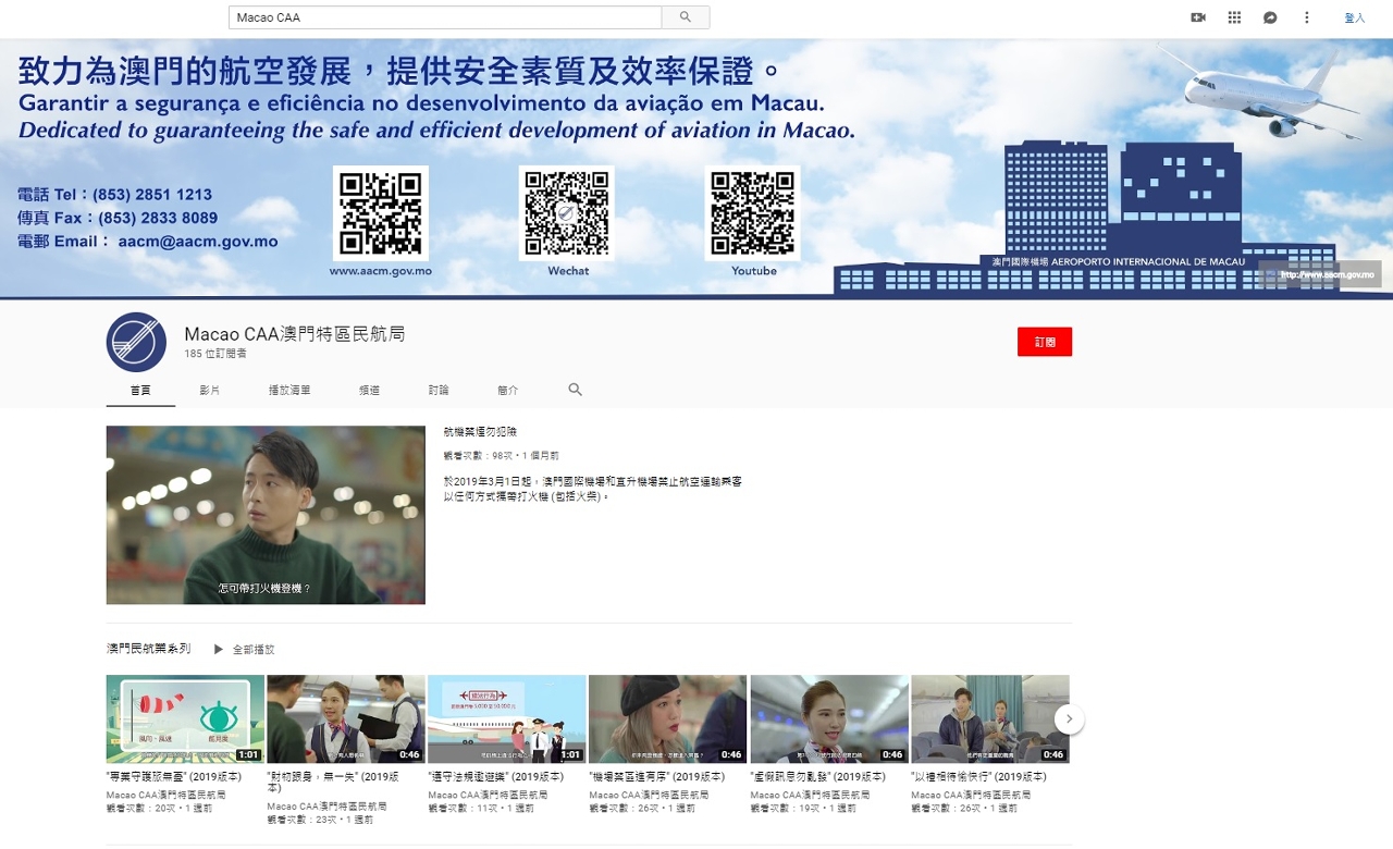 新視頻已全線在民航局的官方網站(https://www.aacm.gov.mo/,“最新消息”章節內的“電視節目”) 和YOUTUBE 專屬頻道( 頻道名稱:“澳門特區民航局” 或“Macao CAA”) 播放。為加強宣傳效力,民航局亦將與澳門國際機場和澳門航空合作,在機場客運大樓內和航機上的電子顯示屏播放短片,進一步擴大視頻播放的覆蓋面。
