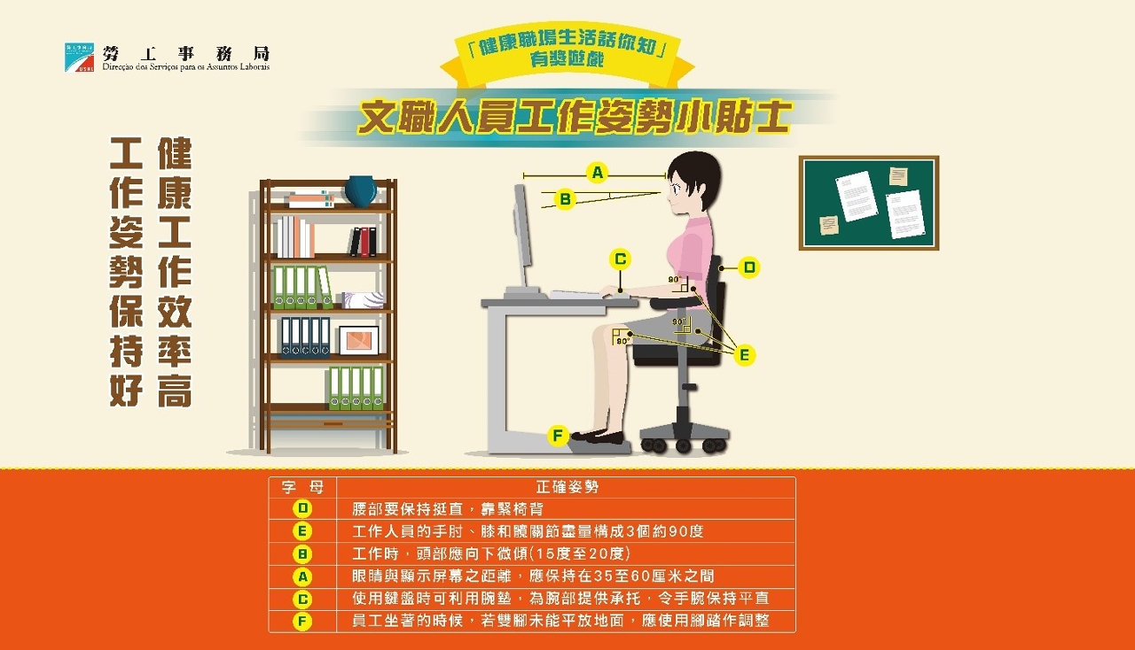 為持續提升文職人員的職業安全健康意識,加強對工作安全和健康的關注,推動本澳文職人員職安健文化發展,勞工事務局舉辦「健康職場生活話你知」有獎遊戲─文職人員工作姿勢小貼士,有關活動已於本年2月28日結束。是次活動反應熱烈,共收到2,585份參加表格,當中有1,542份答對全部問題符合抽獎資格。勞工事務局於日前舉行抽獎儀式,隨機抽出100名得獎者,各得獎者可獲得面值100元超市禮券一張,有關得獎者將獲短訊通知。