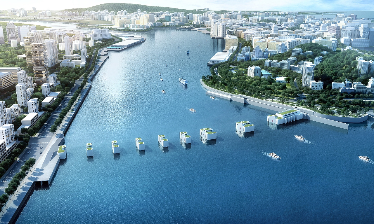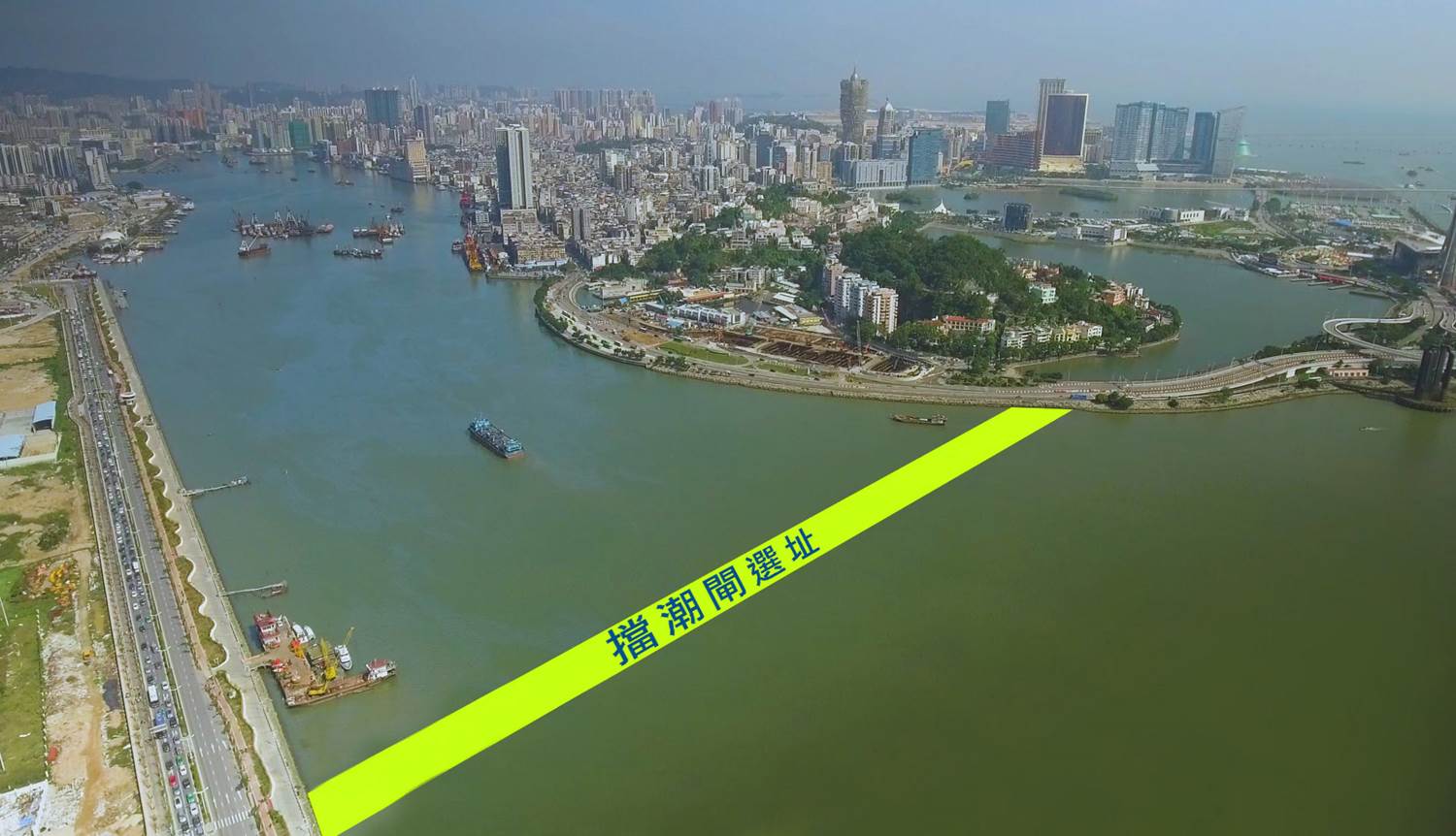 澳門內港擋潮閘工程位於灣仔水道出口,左岸為澳門半島,右岸為珠海市城區,擋潮閘設計標準為200年一遇,相應設計年最高潮位高程為3.85米,擋潮閘總淨寬300米,包括泄水孔、通航孔、排澇泵站、應急船閘及管理區。