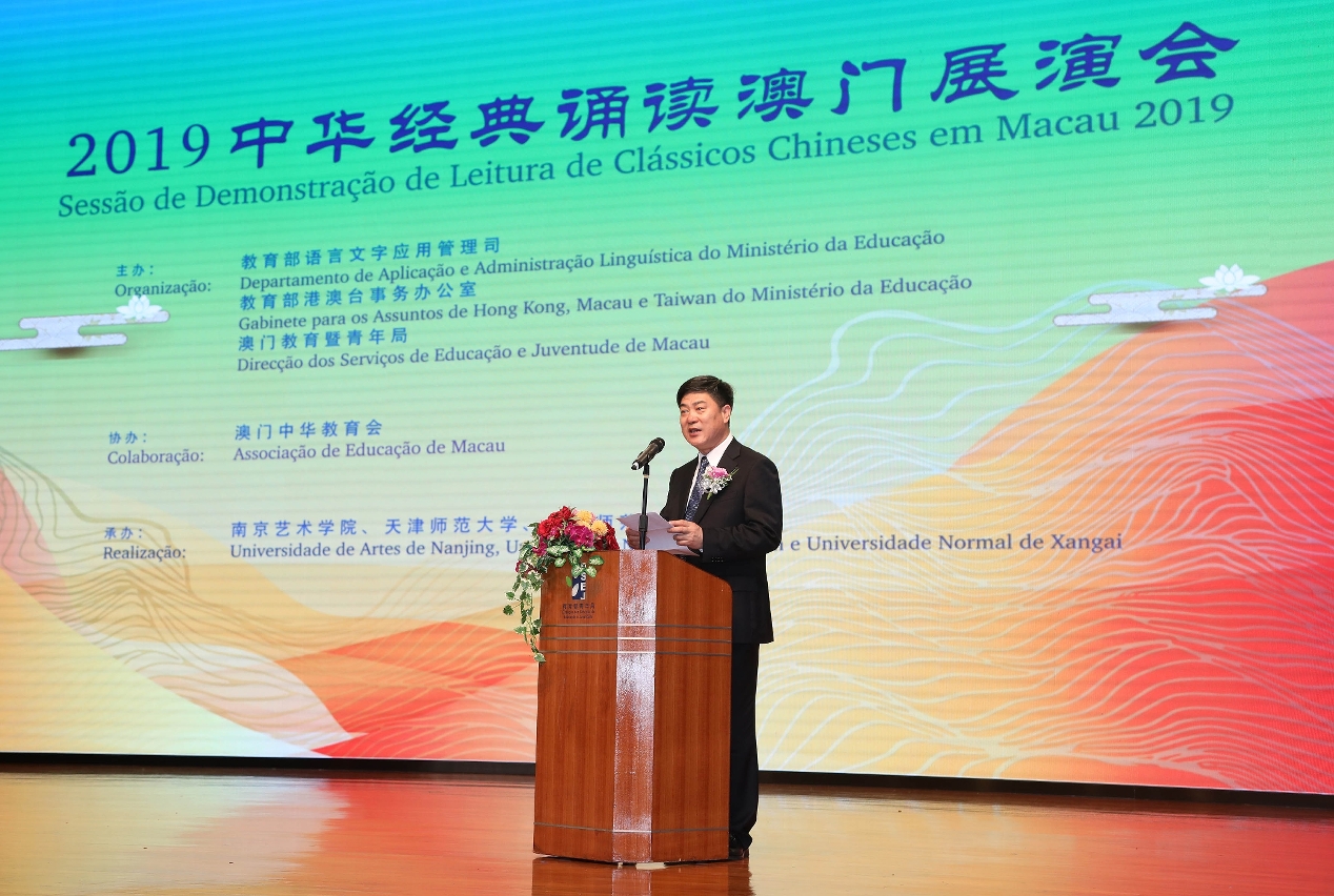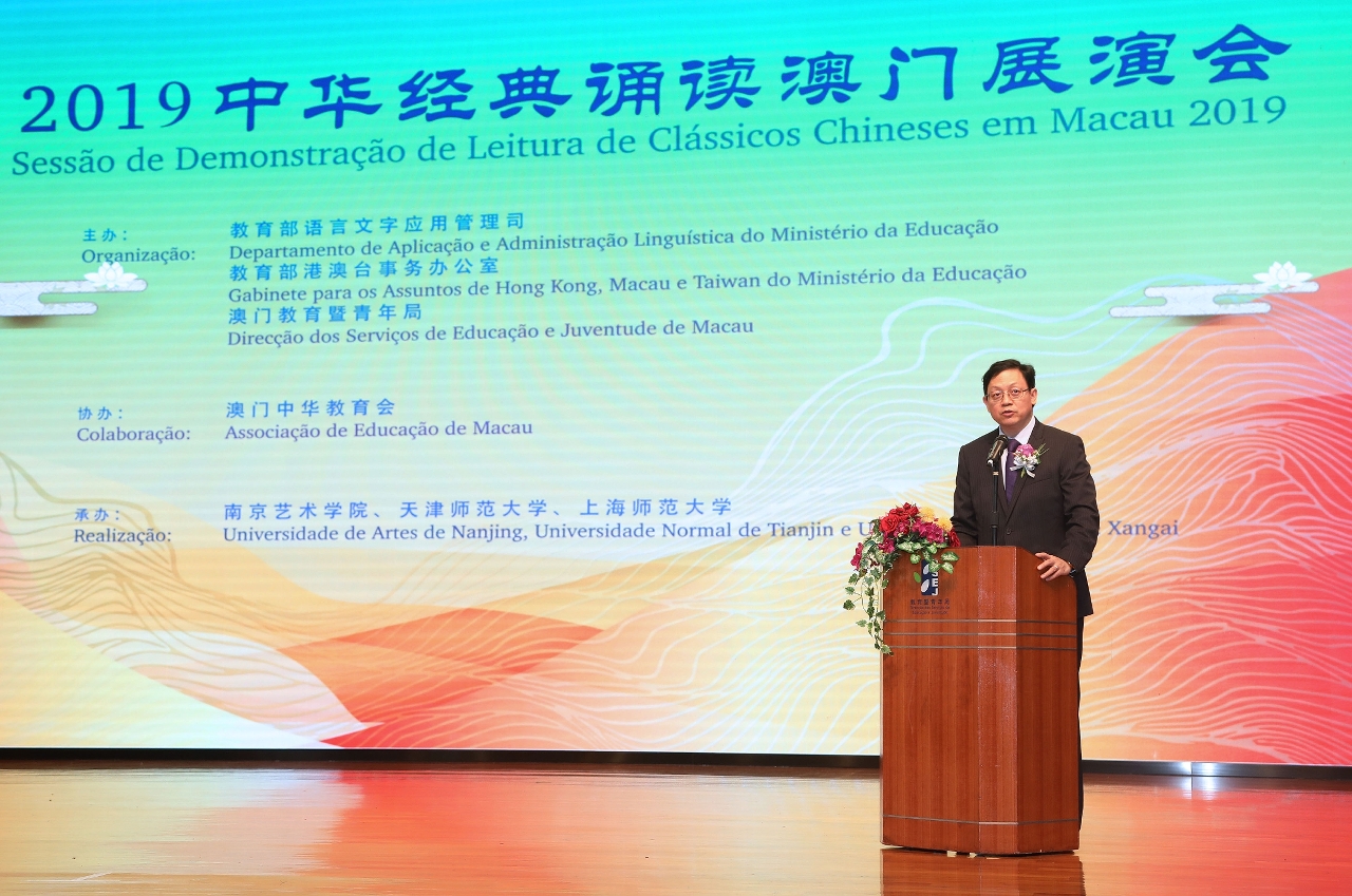 由國家教育部語言文字應用管理司、港澳台事務辦公室及教育暨青年局主辦,澳門中華教育會協辦,南京藝術學院、天津師範大學、上海師範大學聯合承辦的“2019中華經典誦讀澳門展演會”於2019年4月10日下午假濠江中學附屬英才學校禮堂舉行。社會文化司司長譚俊榮、國家教育部機關服務局局長葛振江、教青局局長老柏生、中央人民政府駐澳門特別行政區聯絡辦公室教育與青年工作部部長徐婷、教青局副局長梁慧琪及龔志明、國家教育部語言文字應用管理司宣教處副處長張艷、港澳台事務辦公室幹部李波、澳門中華教育會會長何少金、澳門天主教學校聯會會長周伯輝、澳門公職教育協會理事張佩菁,以及澳門各中小學學校校長、代表與逾五百名師生嘉賓出席。展演會上,葛振江向譚俊榮致送“中華經典資源庫”光碟,寓意中華一家,共同傳承祖國經典文化。