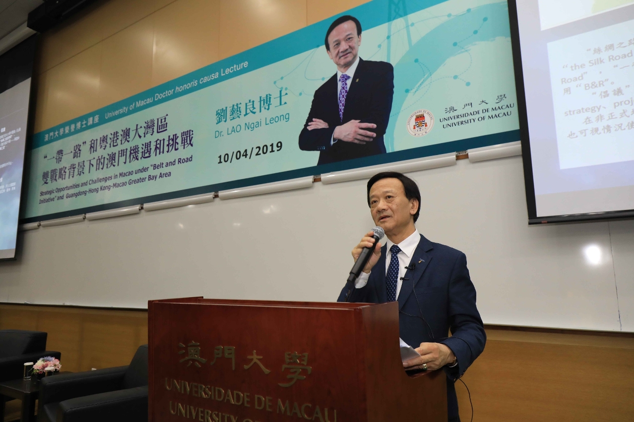 澳門大學榮譽博士劉藝良今(10)日以‘“一帶一路”和粵港澳大灣區雙戰略背景下的澳門機遇和挑戰’為題,分享了澳門如何把握“一帶一路”及粵港澳大灣區的發展優勢,為澳門經濟適度多元創造更有利的營商空間。講座吸引眾多澳大師生、澳門中學師生、業界人士及社會賢達參與,座無虛席。