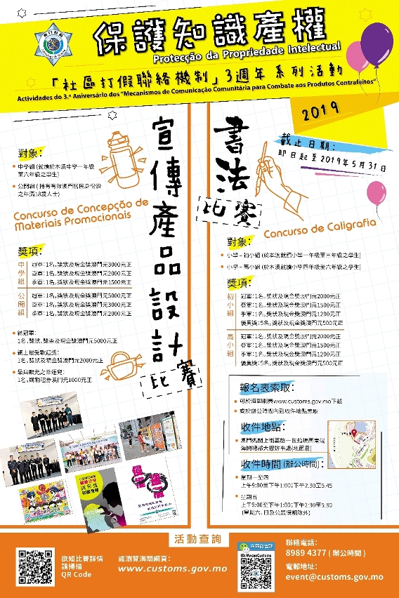 澳門海關於2016年建立「社區打假聯絡機制」,透過與社區團體直接溝通聯繫,掌握社區訊息,從而更有效部署打擊侵權行為,維護知識產權。「社區打假聯絡機制」三周年將至,海關舉辦「保護知識產權」書法比賽及宣傳產品設計比賽,進一步提高市民保護知識產權的意識。比賽報名日期由即日起至5月31日,獎金及獎品豐富,歡迎全澳學生及市民踴躍參與。