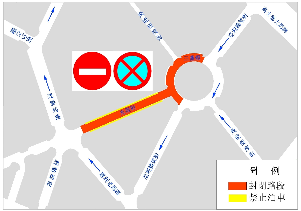 介乎連勝馬路與三盞燈之間的一段光復街之輕型車輛泊車位。 |