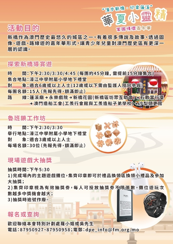 為有效地推廣歷史文化,促進學生對中華及本土歷史文化的認識,澳門基金會及其歷史文化工作委員會於本年4月27日(星期六)下午1:00-5:30於濠江中學附屬小學舉辦“漫步新橋.印象蓮溪──華夏小靈精家國情懷嘉年華”,透過攤位遊戲、導賞、展示等形式,靈活生動地介紹中華文化及澳門歷史相關主題內容,讓市民更認識祖國,了解澳門。
