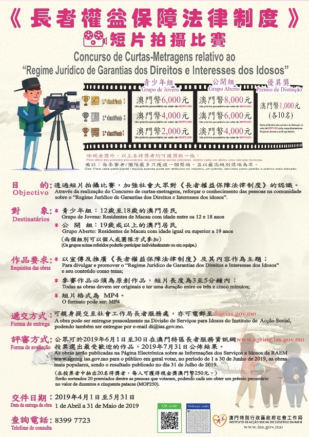 是次比賽目的為推廣《長者權益保障法律制度》的內容,宣揚全社會共同維護長者權益的訊息。有興趣的市民可於社工局網頁www.ias.gov.mo查閱比賽章程,並於5月31日或之前將3至5分鐘的短片作品電郵至di@ias.gov.mo,或遞交至巴掌圍斜巷19號南粵商業中心13樓社工局長者服務處。如有查詢,可致電社工局長者服務處8399 7723。