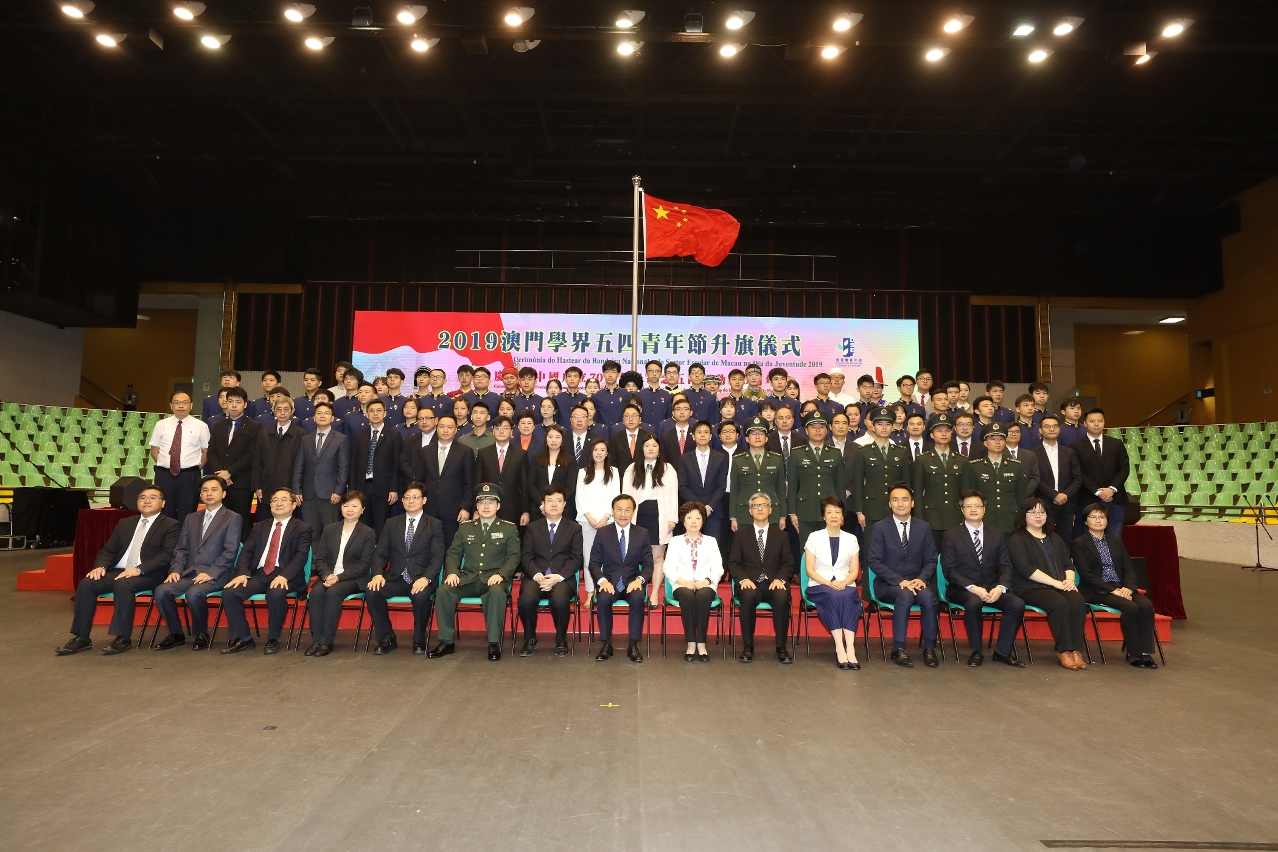 升旗儀式在培正中學管樂團的伴奏下,首次亮相的“澳門學界升旗隊”精神奕奕地步操到舞台邊。當國歌奏響,升旗手有力地揚起國旗,五星紅旗徐徐升起。在何東中葡小學、聖家學校、粵華中學、嘉諾撒聖心英文中學、聖公會(澳門)蔡高中學、鏡平學校(中學部)、濠江中學及澳門坊眾學校8所學校合唱團的引領下,場內逾2,000名參加者共同高唱國歌,整個場館響徹嘹亮的歌聲,洋溢高漲的愛國之情。在譚俊榮、薛曉峰、沈蓓莉、徐良才及老柏生等人的監誓下,“澳門學界升旗隊”進行宣誓,莊嚴承諾將克盡己任、貢獻國家。隨後,場館內播放短片《蛻變成長 我願承擔》,場內青年學生一起回味升旗隊揮灑青春汗水、學習升掛國旗、傳承學界愛國傳統的歷程。緊接著來自中葡職業技術學校及鏡平學校(中學部)的兩名學生司儀介紹五四青年節的緣起和精神,增進活動參加者對相關歷史的認識。為表現中華民族的團結,“2019‧中華民族文化週"的民族青年代表於現場表演民族歌舞,數十位學生和民族青年傾力演出,展現青少年間的共融與和諧。嘉賓與“澳門學界升旗隊”及民族青年代表合影留念後,活動在國旗映照的熱鬧氣氛中圓滿結束。