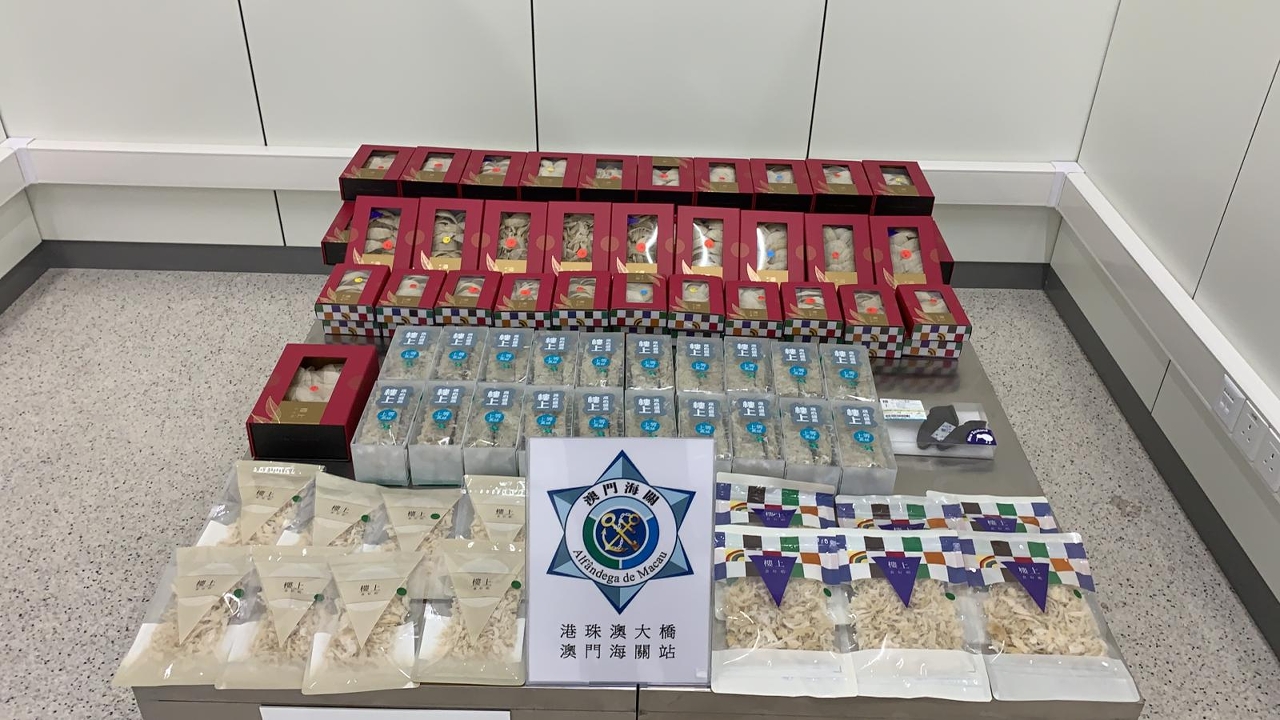 本月4日及5日,海關關員分別截查兩名由香港經港珠澳大橋口岸入境澳門的旅客,發現攜帶的物品有可疑並進行詳細檢查。在首日涉事旅客的物品內查獲約重14公斤乾花膠,並在次日涉事旅客的物品內查獲1盒鹿尾巴、14包白燕盞絲、20盒燕絲及62盒燕窩,兩批貨物價值合共港幣約70,000元。