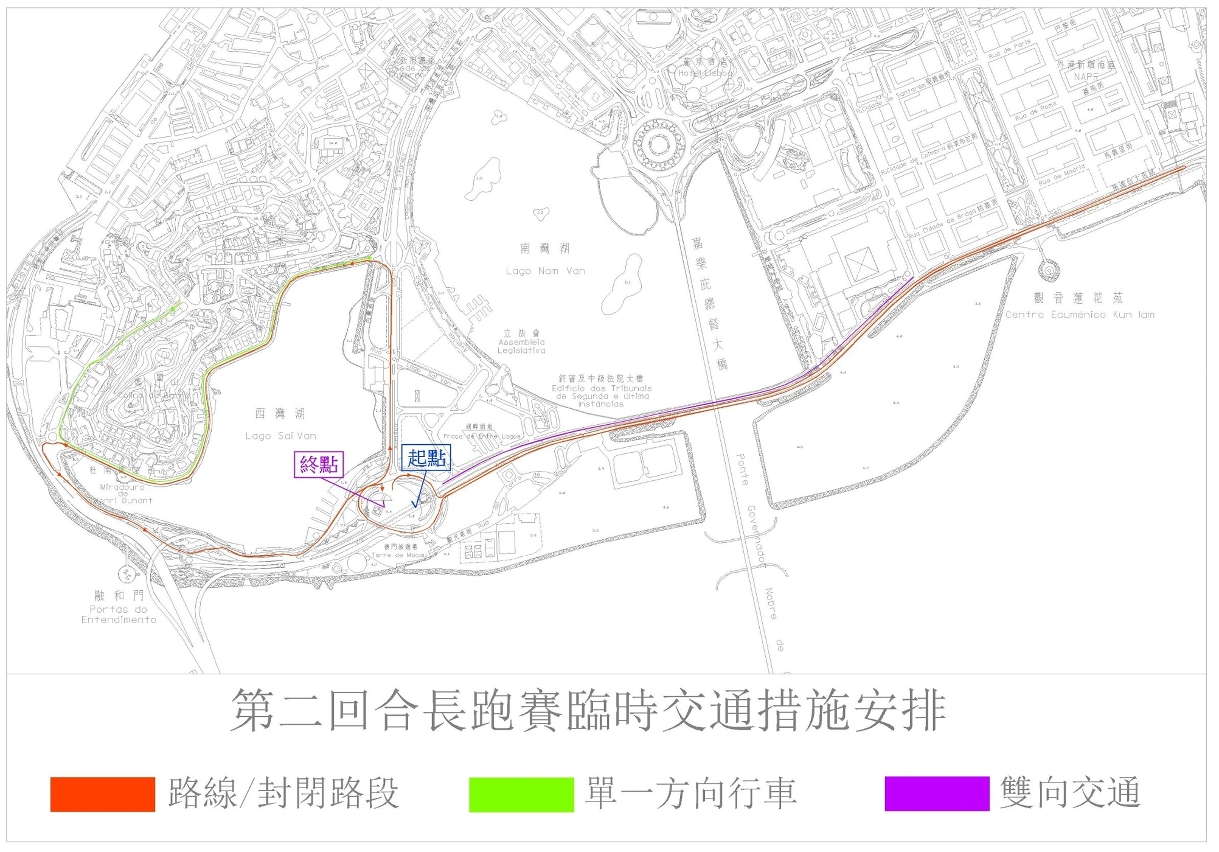 配合體育局舉辦第二回合長跑聯賽,西灣湖廣場一帶道路於5月11日(周六)至12日(周日)實施臨時交通措施,多條巴士路線改道行駛,部份巴士站須臨時停用(詳見附表),交通事務局呼籲公眾留意,詳情可瀏覽交通事務局網頁www.dsat.gov.mo。
