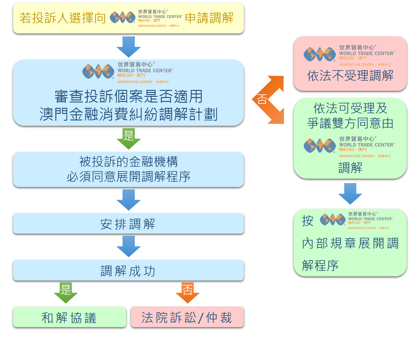 “調解計劃”是參考了鄰近地區的金融消費糾紛調解模式,並結合澳門實際情況,由金管局、消委會和世貿仲裁中心三方商討設立,所有獲金管局許可的金融機構將成為“調解計劃”的成員。有關“調解計劃”覆蓋申索額不高於100萬澳門元的金融消費爭議,且投訴人首次知悉其損失之日起計兩年內提出的調解請求。