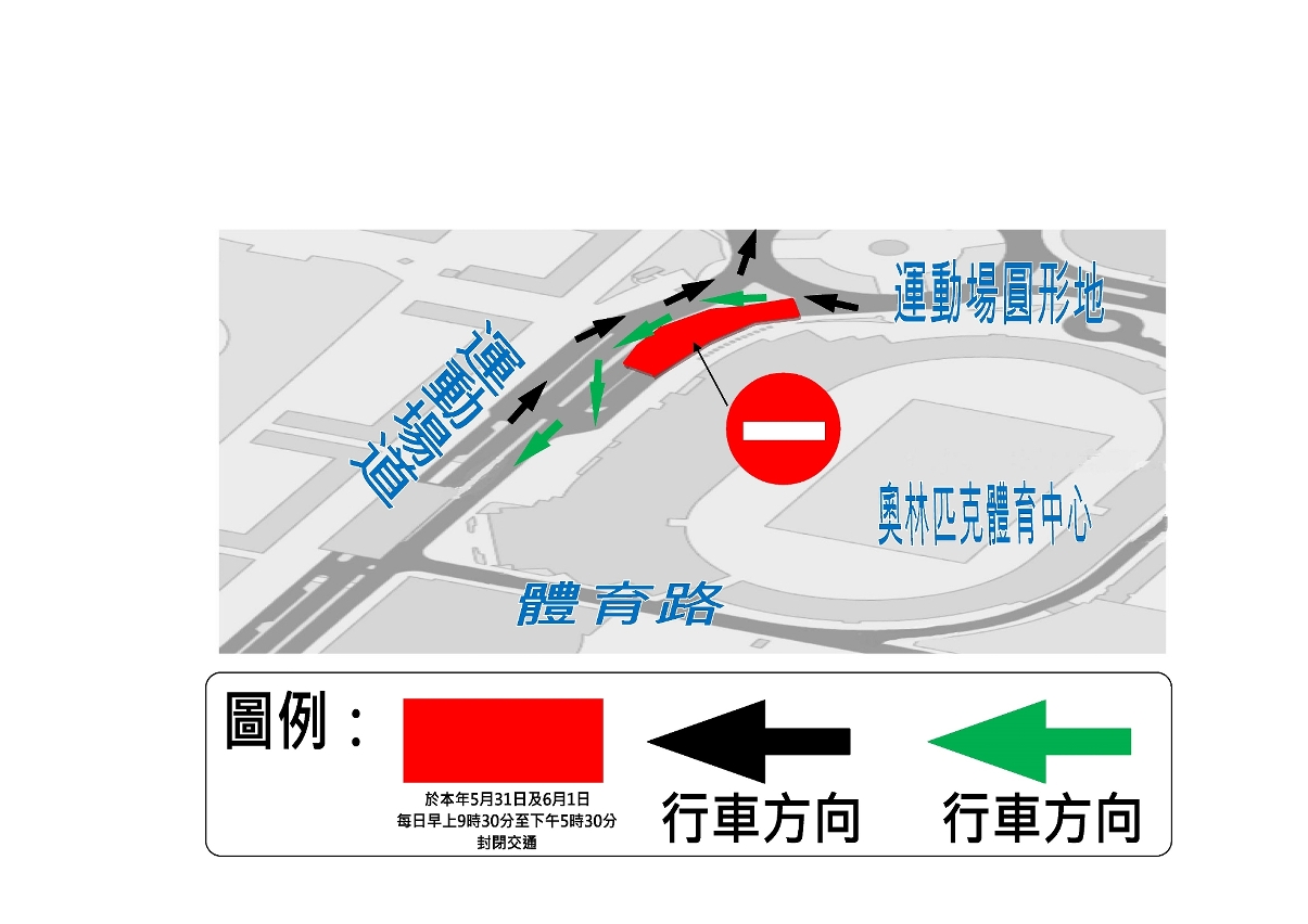 配合土地工務運輸局安裝行人天橋及市政署疏通排水管道,5月31日(周五)至6月3日(周一)氹仔運動場道及成都街實施臨時交通措施,詳情請查閱下表,交通事務局呼籲駕駛者留意。