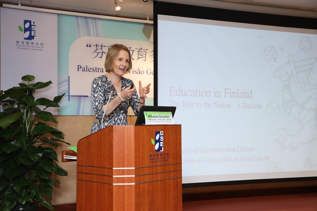 為了讓澳門非高等教育學校校長及其他中、高層管理人員瞭解芬蘭教育改革及實施科學創意教育的現況和經驗,教育暨青年局於2019年5月29日(星期三)下午在教青局仲尼堂舉辦“芬蘭教育多面體——科學及創意教育”講座,邀請芬蘭總領事館(香港及澳門)總領事Johanna Karanko女士及芬蘭教育專家Petra Sarja女士、Tanje Amate女士及Stuart Patton先生擔任演講嘉賓。出席是次講座的有中聯辦教育與青年工作部徐婷部長、教青局代局長梁慧琪、代副局長黃健武及各級主管,學校校長及代表等近180人。