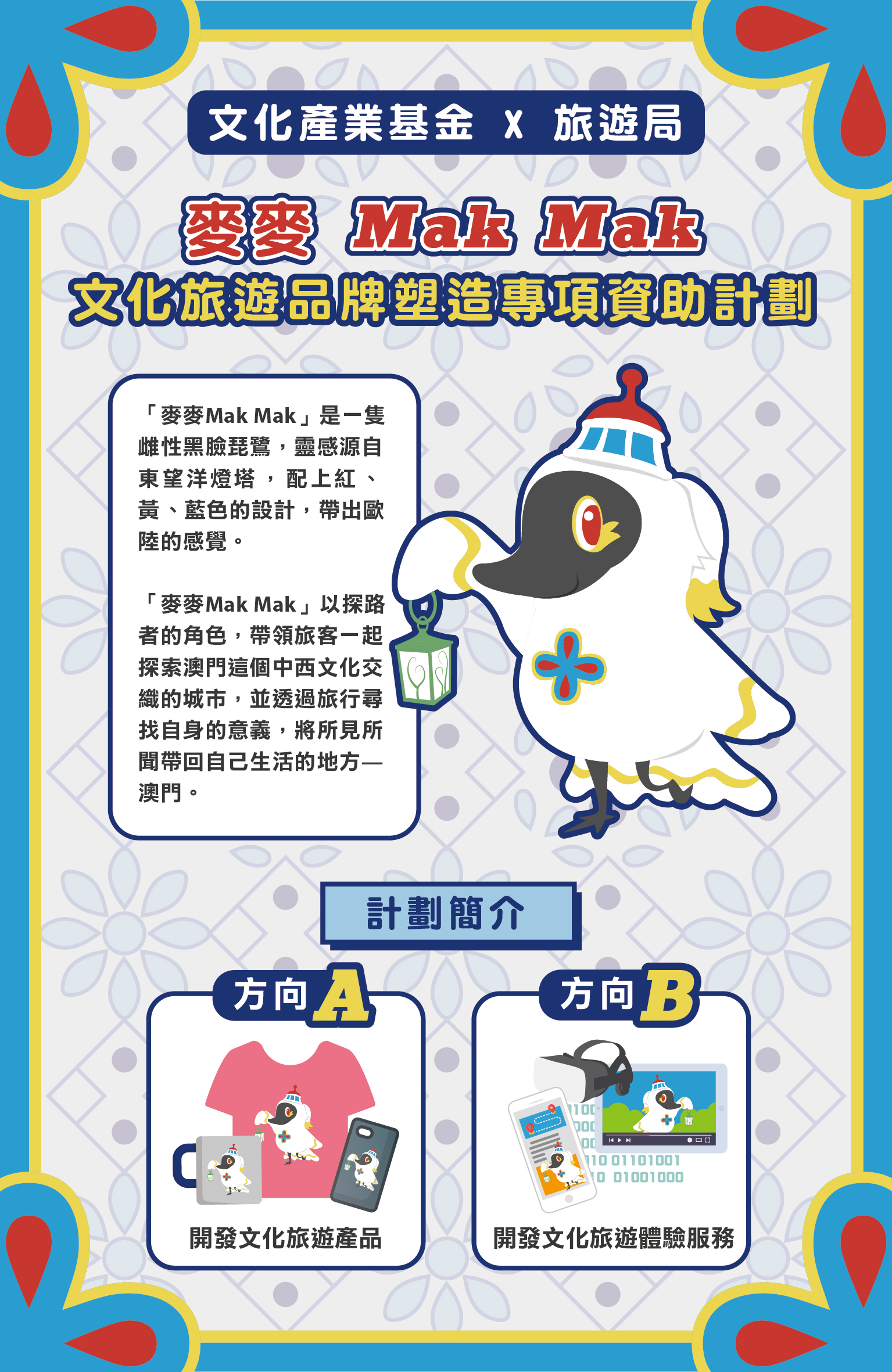 配合澳門建設為世界旅遊休閒中心,鼓勵澳門文創企業挖掘澳門的文化元素,開發新的文化旅遊產品和體驗服務,文化產業基金與旅遊局合作,以澳門旅遊吉祥物“麥麥 Mak Mak”為主題,推出文化旅遊品牌塑造專項資助計劃。申請項目必須有澳門文化旅遊元素,根據“麥麥 Mak Mak”的設計概念,以及旅遊吉祥物推廣澳門旅遊業的宗旨,推出文化旅遊產品或開發澳門的文化旅遊體驗服務。