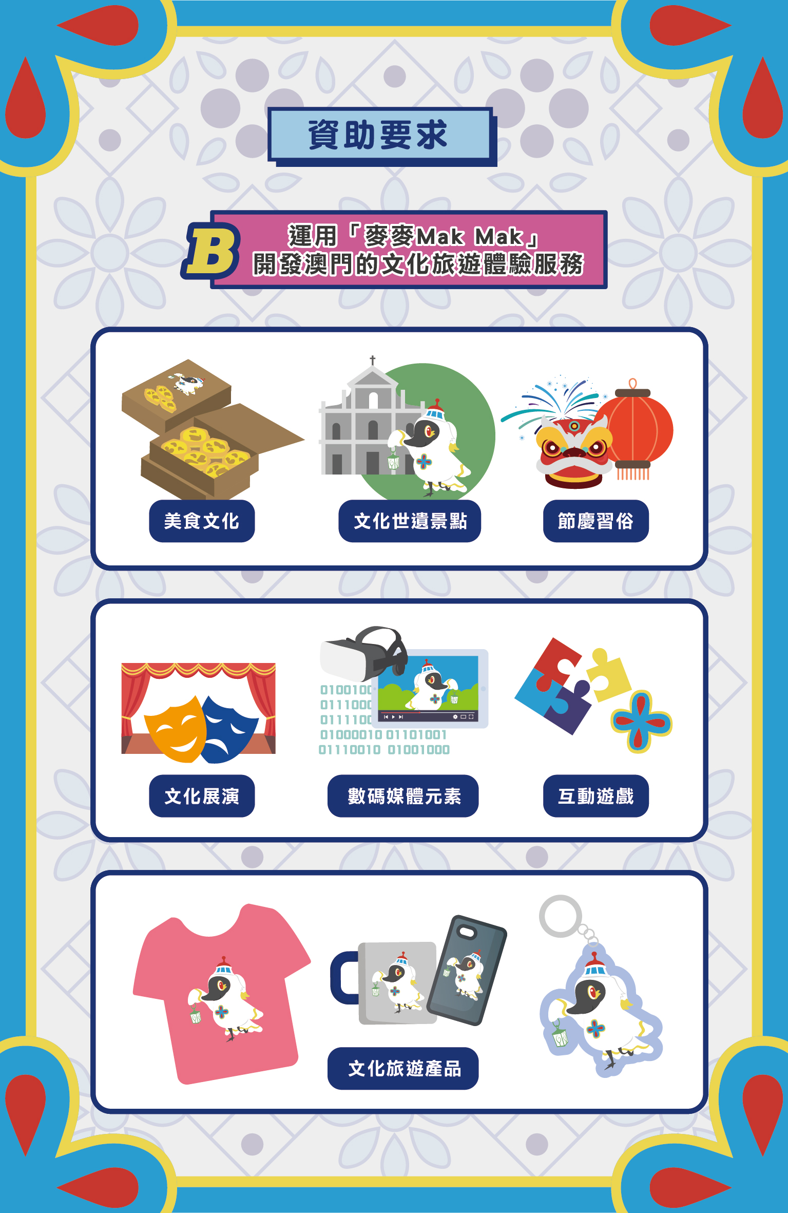 運用“麥麥 Mak Mak”開發澳門的文化旅遊體驗服務的項目,須與澳門的文化元素有關連,如文化世遺景點、新舊建築、美食文化、社區歷史古蹟、社區文創、風景旅遊、非物質文化遺產或節慶習俗等;須結合文化展演或引入數碼媒體元素,如動漫、數字化技術 (AR擴增實境、VR虛擬實境、MR 混合實境等)、互動遊戲等,並可同時開發「麥麥Mak Mak」的文化旅遊產品。鼓勵項目由多家企業合作完成,由一家企業作為項目主體進行申請,申請者可以自由組合內容開發獨特的文化旅遊體驗服務。