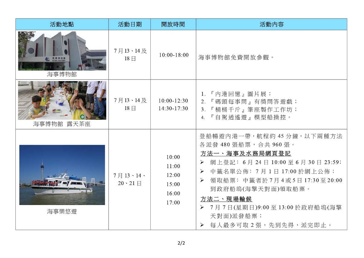 為慶祝7月18日“海事及水務局日”,局方將於7月舉行系列活動,與眾同樂,包括“海事及水務局同樂日”、“海事樂悠遊”等,而轄下的東望洋燈塔及海事博物館亦會免費對外開放。活動豐富有趣,老少咸宜,適合親子同樂,歡迎市民踴躍參與,豐富盛夏餘暇,充實海事見聞。活動詳情可瀏覽www.marine.gov.mo。