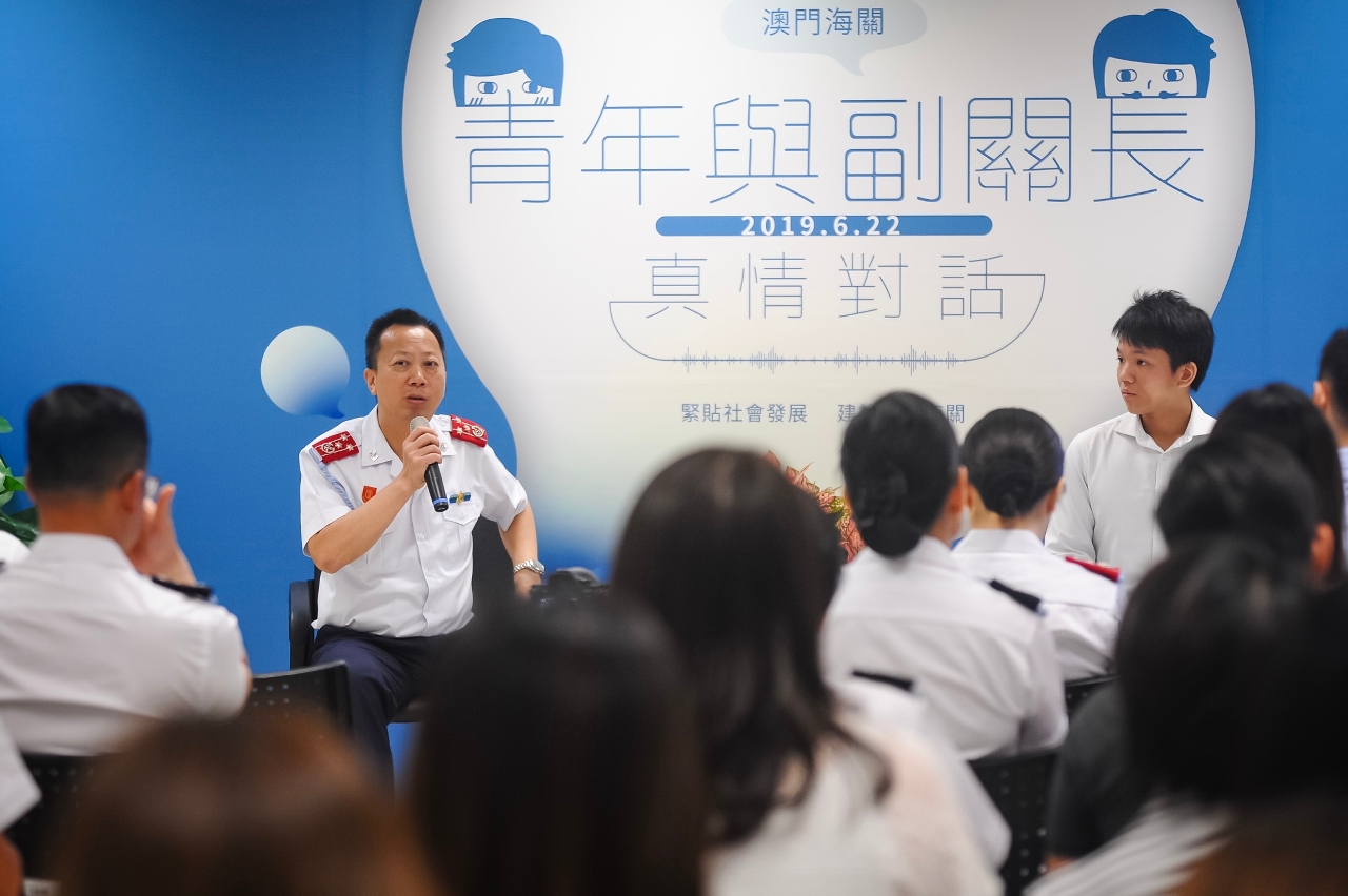 為促進與青年的交流互動,聆聽年青人對政府工作的意見,配合特區政府的青年政策,澳門海關於本月22日下午舉辦“青年與副關長真情對話”活動。是次活動以“緊貼社會發展,建設智慧海關”為主題,來自澳門中華新青年協會、鄂澳青年交流促進會、澳門婦聯青年協會的50名青年,與海關代副關長黃文忠一同探討海關在智慧警務方面的發展。活動加深了青年人對澳門海關工作的認識。
