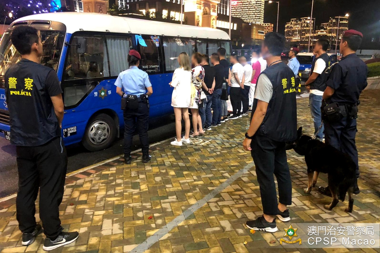 其中,特警隊帶同警犬於昨日 (22日) 晚上進行「雷霆2019」行動,在新口岸及路氹金光大道一帶巡查,期間截查了50名人士(33男17女),當中17人(12男5女)需帶返警局調查,經調查發現15名涉嫌從事非法兌換貨幣、2名涉嫌從事賣淫活動,有關人士已被送交相關部門作跟進。