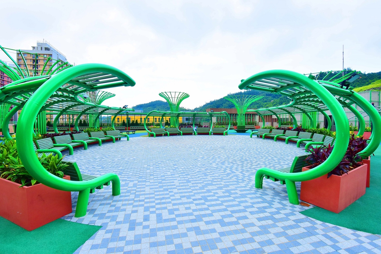 成人健身區:於緩步徑沿線設置多種複合型成人健身器材,每組可供多人同時使用,並附以特色造型遮陽花架及座椅,為居民提供鍛鍊身體的優質設施。