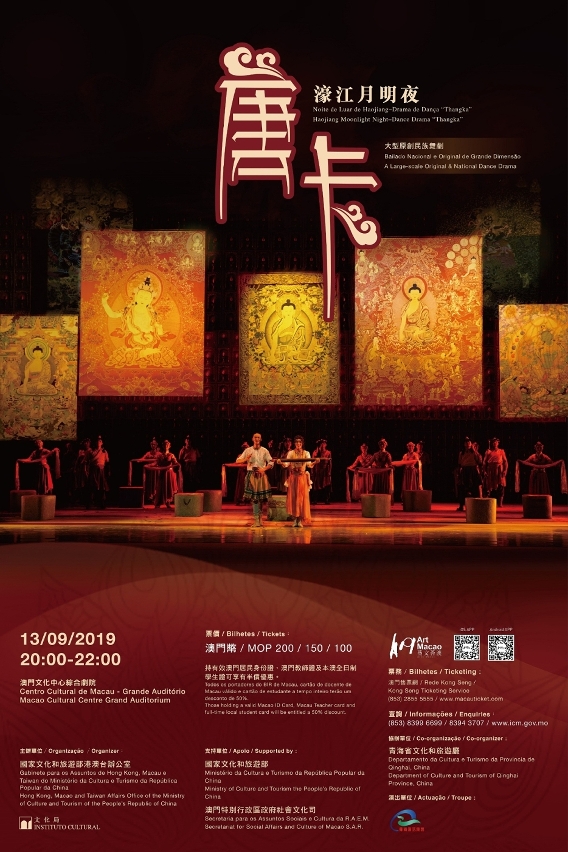 為慶祝中秋佳節,“藝文薈澳”系列活動濠江月明夜-舞劇《唐卡》,將於9月13日晚上八時在澳門文化中心綜合劇院上演。是次節目由國家文化和旅遊部港澳台辦公室與文化局共同主辦、國家文化和旅遊部及澳門特別行政區政府社會文化司支持、青海省文化和旅遊廳協辦,並由青海省演藝集團有限責任公司擔綱演出,門票於8月1日起於澳門售票網公開發售。