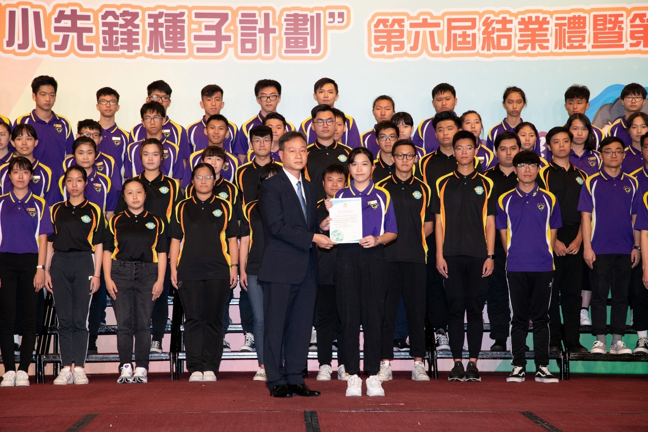 典禮上,首先進行第一屆“社區安全青年領袖計劃”及第六屆“滅罪小先鋒種子計劃”結業儀式,共有32位社區安全青年領袖和102位滅罪小先鋒學員順利完成課程及達標,獲頒發結業證書,並有30位表現優秀的滅罪小先鋒學員,獲頒嘉許狀及獲委任為小隊長,協助帶領新學員接受培訓;另有11位第五屆小隊長及4位歷屆優秀領袖學員,在過去一年積極協助帶領第六屆學員參與培訓,以及參與司警局舉辦的防罪宣傳活動,獲頒授優秀領袖獎狀和傑出表現獎狀。