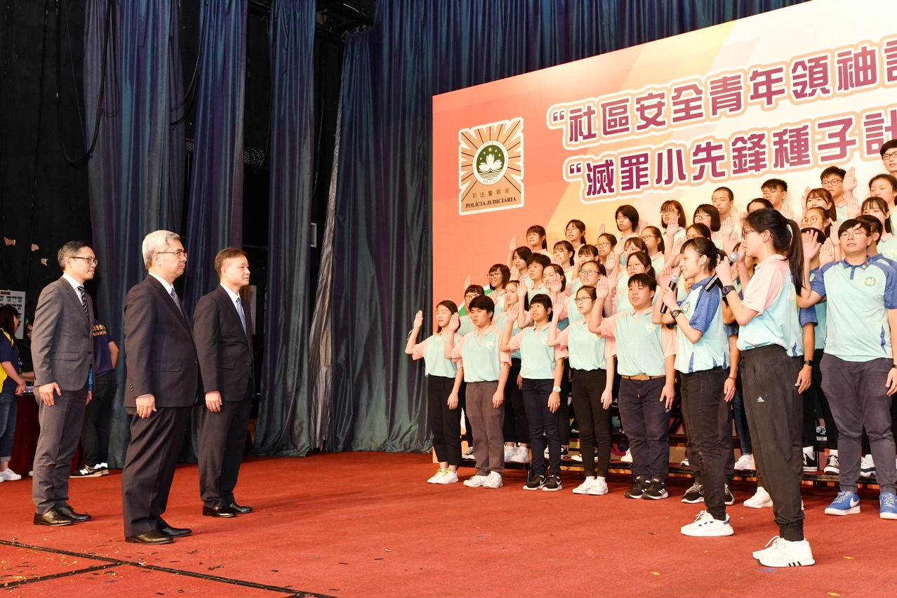 隨後,第二屆“社區安全青年領袖計劃”及第七屆“滅罪小先鋒種子計劃”同時啟動;今年分別有來自本澳6間大專院校、67名大專學生,以及來自34間中學、198名中學生參加。保安司司長黃少澤和警察總局局長馬耀權在司警局局長薛仲明陪同下監誓和見證,學員由代表帶領進行莊嚴宣誓,新一屆青少年防罪培訓計劃正式啟動。