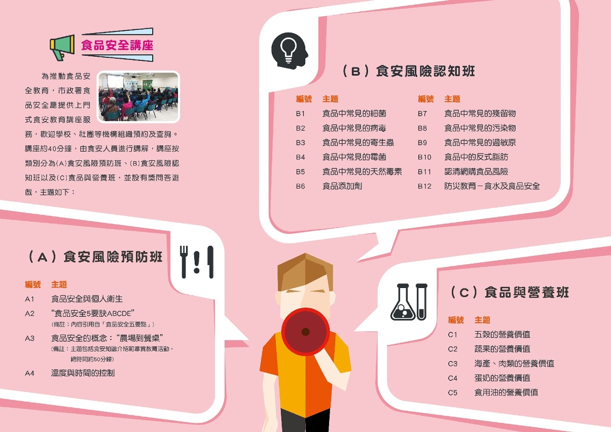 食品安全須政府、業界及消費者共同努力維護,市政署持續透過多元化渠道與眾持分者進行風險交流及教育,從而更全方位地提升社會的自主食安防護意識。2019/20學年開學來即,市政署繼續提供三大單元合共21個主題的食安教育講座,鼓勵有意報讀或組織預約講座的教育機構及團體登入食品安全資訊網頁www.foodsafety.gov.mo的「食安講座及導賞服務」專頁瞭解更詳細內容,亦可下載及填妥報名表格,傳真至8296 9948,屆時將有專人聯絡及跟進安排講座。若有任何疑問,歡迎致電食安專線2833 8181查詢。