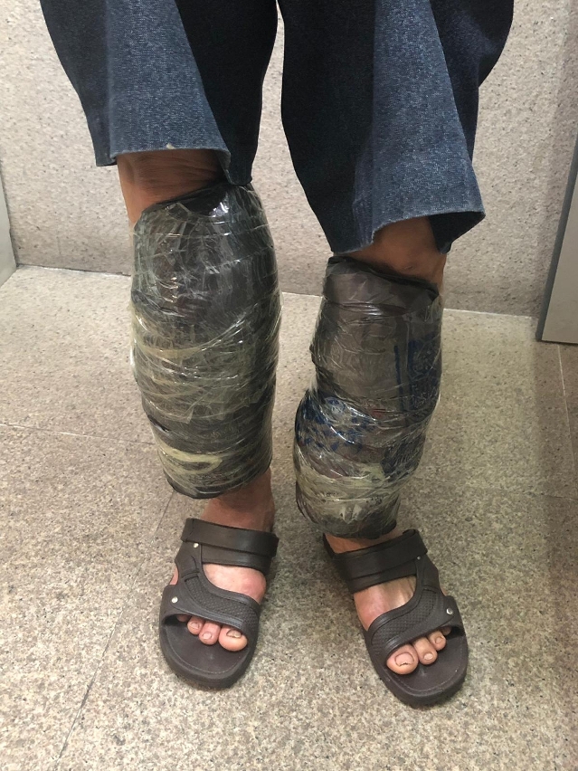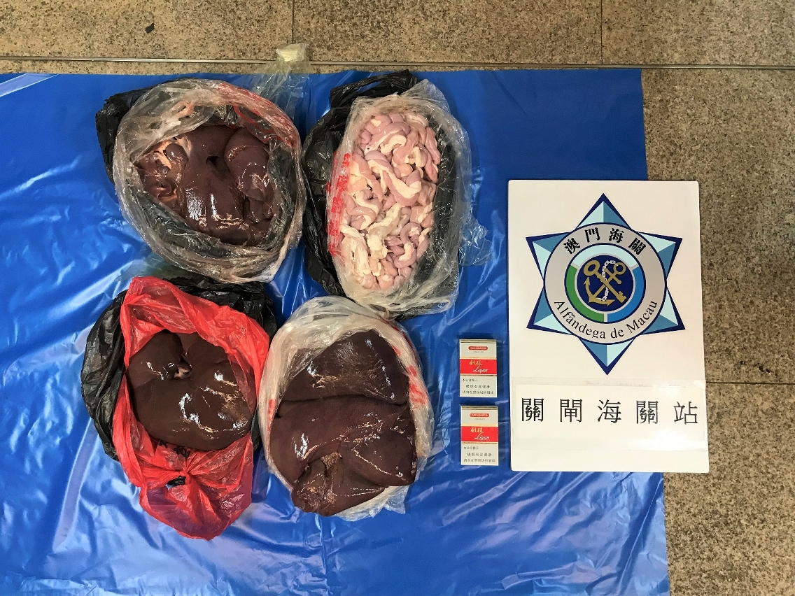 本月4日下午,關閘口岸關員於入境旅客檢查區執勤時,發現一名男子步履蹣跚,經檢查發現其斜揹袋、手持的膠袋及小腿位置綁纏物品偷運入境,最終共搜獲豬內臟7.3公斤及香煙40支。涉案的本澳男子,年約65歲,報稱無業,海關已根據《對外貿易法》之相關規定對其作出起訴,一經判罰,可科處澳門幣5千元至10萬元罰款,而被查獲的貨物亦會宣告歸澳門特別行政區所有。
