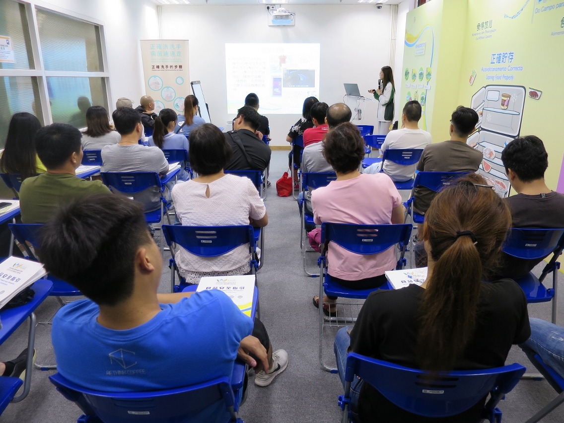 「食品安全與環境衛生基礎班」恆常於每月最後一個星期四下午三時至五時,在祐漢小販大樓一樓食品業界專區舉辦。有關課程內容涵蓋《食品安全法》、食安標準,以及食品安全操作指引等內容,有助加深業界認識《食品安全法》中所訂明的責任及義務,嚴格遵守法例及食安標準生產經營;同時,課程以《外賣及堂食處理食品衛生指南》為輔助教材,介紹食品的採購、貯存、處理,個人衛生及日常操作中容易忽略的食安要點等;並根據「食品安全五要訣ABCDE」,講解避免交叉污染(Avoid Cross Contamination)、謹慎選購(Buy Right)、保持清潔和徹底煮熟(Clean and Cook Completely)、危險温度帶(Danger Temperature Zone)以及努力維護澳門食品安全(Efforts to maintain Macao food safety)等關鍵技巧及重要理念。