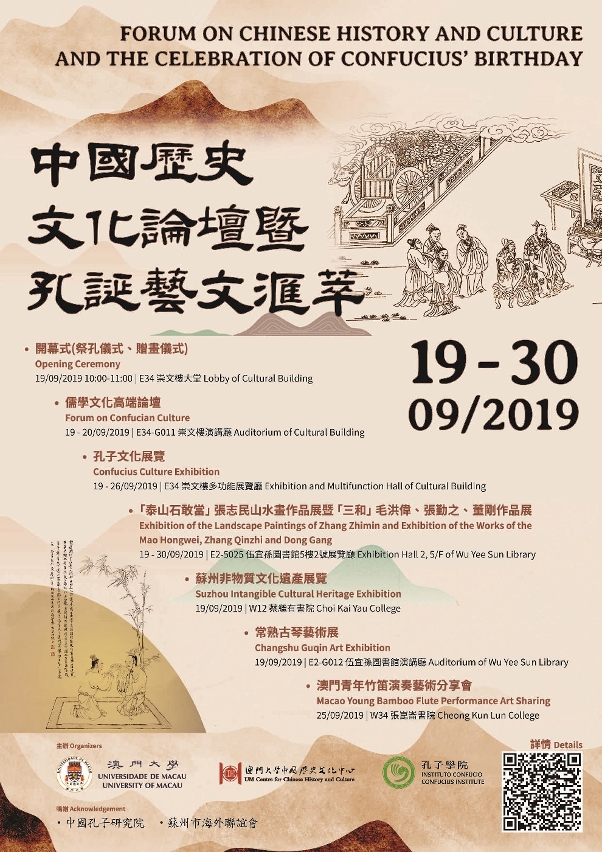澳門大學將於9月19至30日舉行一系列文化活動、論壇和文藝展覽,讓大眾在澳大校園感受儒家文化的優良傳統,深入了解中國傳統文化中的儒學思想及其在當代社會的發展和演變,從而增強民族文化自信,其中“中國歷史文化論壇暨孔誕藝文匯萃”開幕儀式將於9月19日(下週四)上午十時在澳大崇文樓(E34)舉行。