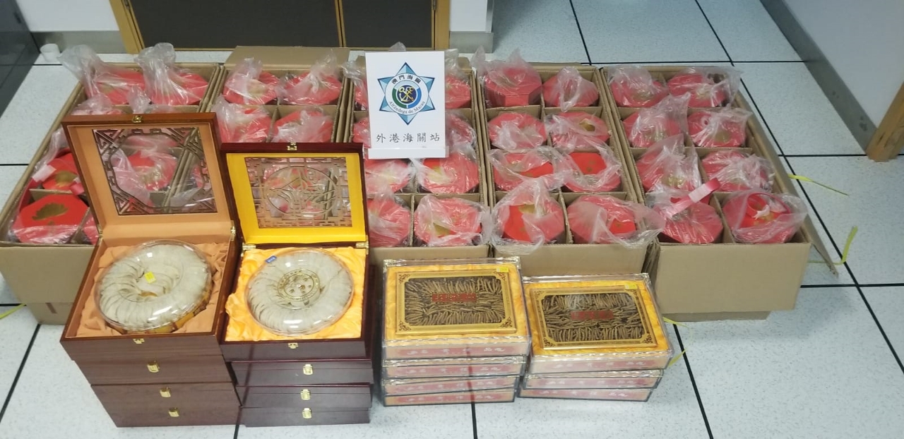 本月11日下午,海關關員截查一名由香港乘坐客船抵澳的旅客,經X光機及關員檢查,於涉事旅客的物品內共查獲6公斤乾燕窩、4.3公斤冬蟲夏草及月餅200個,該批物品價值合共澳門幣77,000元。
