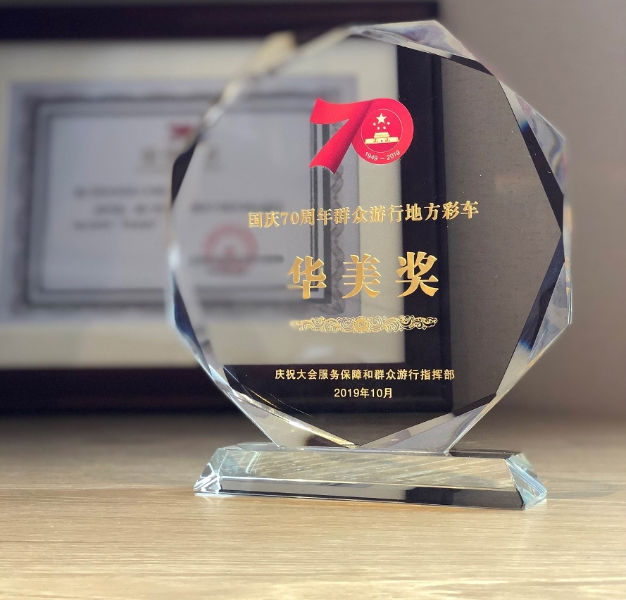 慶祝大會服務保障和群眾遊行指揮部組織專家隊伍,對34輛國慶當日參與群眾遊行環節的地方花車進行獎項評選,分別從花車創意構思、製作技術、藝術效果等方面,不分排名等次設置“匠心獎”、“華美獎”和“創新獎”三個獎項,澳門主題花車榮獲“華美獎”。為體現中央政府的大力支持,特區政府和居民一直以來的共同努力,澳門社會繁榮、和諧共融,體現澳門宜行、宜遊、宜樂、宜業和宜居的城市特色,澳門花車設計以“蓮花綻放”造型為主視覺元素,並加入大三巴牌坊和澳門大學新校園等造型,展示城市新舊交融;車身金色曲線代表澳門主要城市意象之一的大橋,寓意澳門一直以來的中西文化橋樑的作用;車底以浪花造型顯示澳門作為沿海城市的元素,比喻澳門全年盛事不斷的豐富體驗。