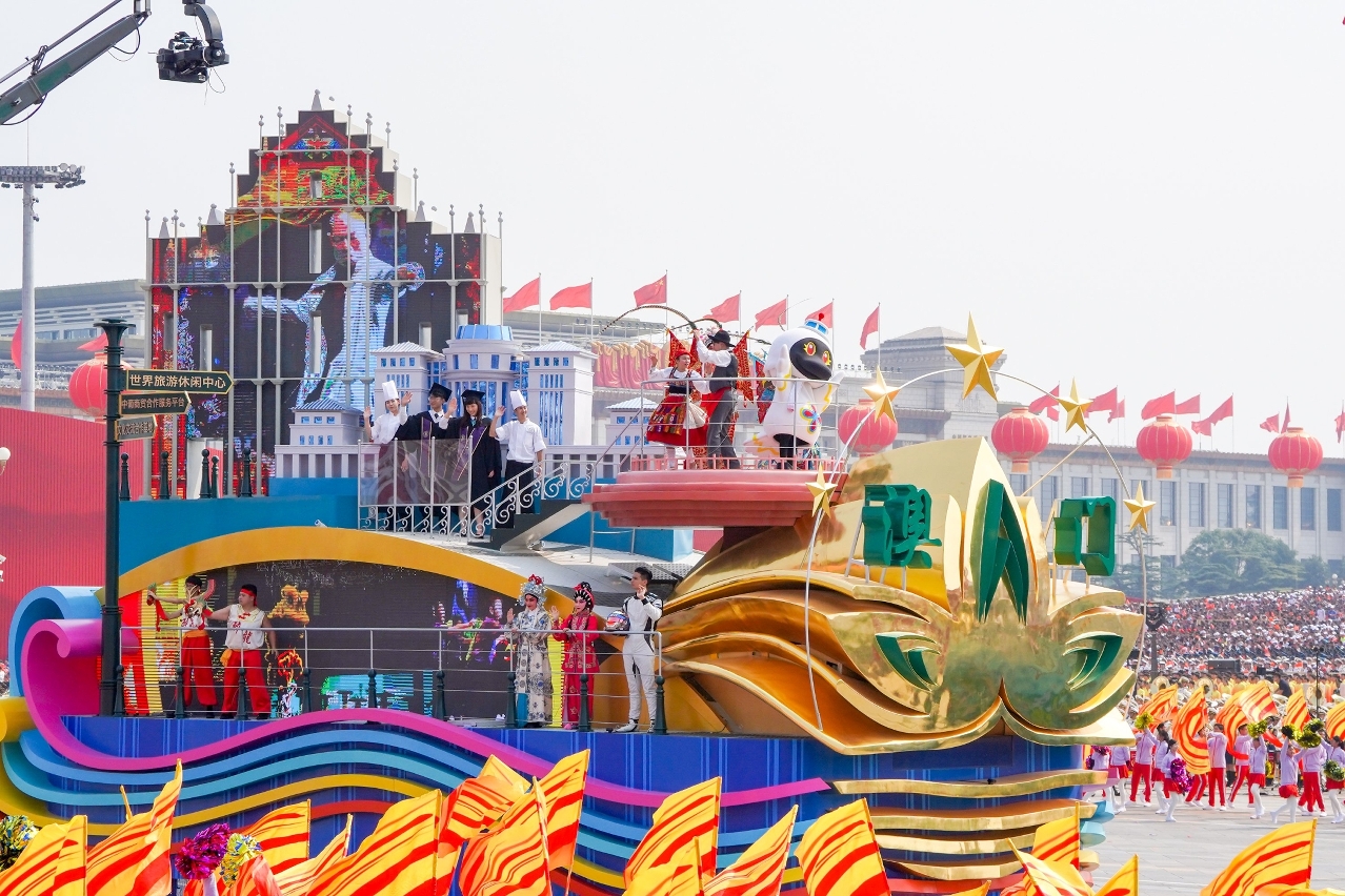 當日,澳門旅遊吉祥物麥麥與多個領域的澳門人士匯聚在花車上,表現多元文化共融共處,包括:賽車運動領域、高等教育領域、廚師領域、澳門非物質文化遺產領域、澳門土生文化領域和節慶領域等,一同向現場和觀看直播的觀眾送上來自澳門的祝福,共同分享國慶喜悅,展現出澳門的熱情和魄力。