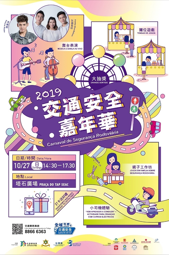 「2019交通安全推廣」重頭活動—交通安全嘉年華將於10月27日(周日)下午2時30分假塔石廣場舉行,現場設有攤位遊戲、親子工作坊、小司機體驗、打卡送好禮、幸運大抽獎及精彩舞台表演,澳門組合灰藍氣球及歌手馬檇鏗會到場獻唱助慶,歡迎廣大市民到場參加,詳情可瀏覽交通事務局網頁www.dsat.gov.mo。