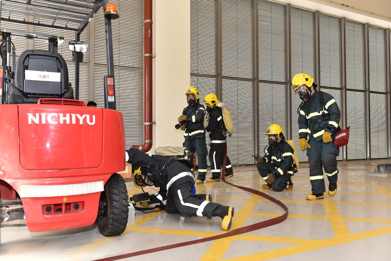 演習模擬輕軌車廠維修區內有一輛電池機車冒出濃煙而觸發火警警報系統,車廠保安中心致電消防局求助,同時啟動緊急疏散程序。期間保安人員嘗試撲滅火警,本局接報後隨即按相關預案派出緊急車輛及人員到達現場,並向車廠保安人員瞭解情況,隨即展開滅火救援工作。