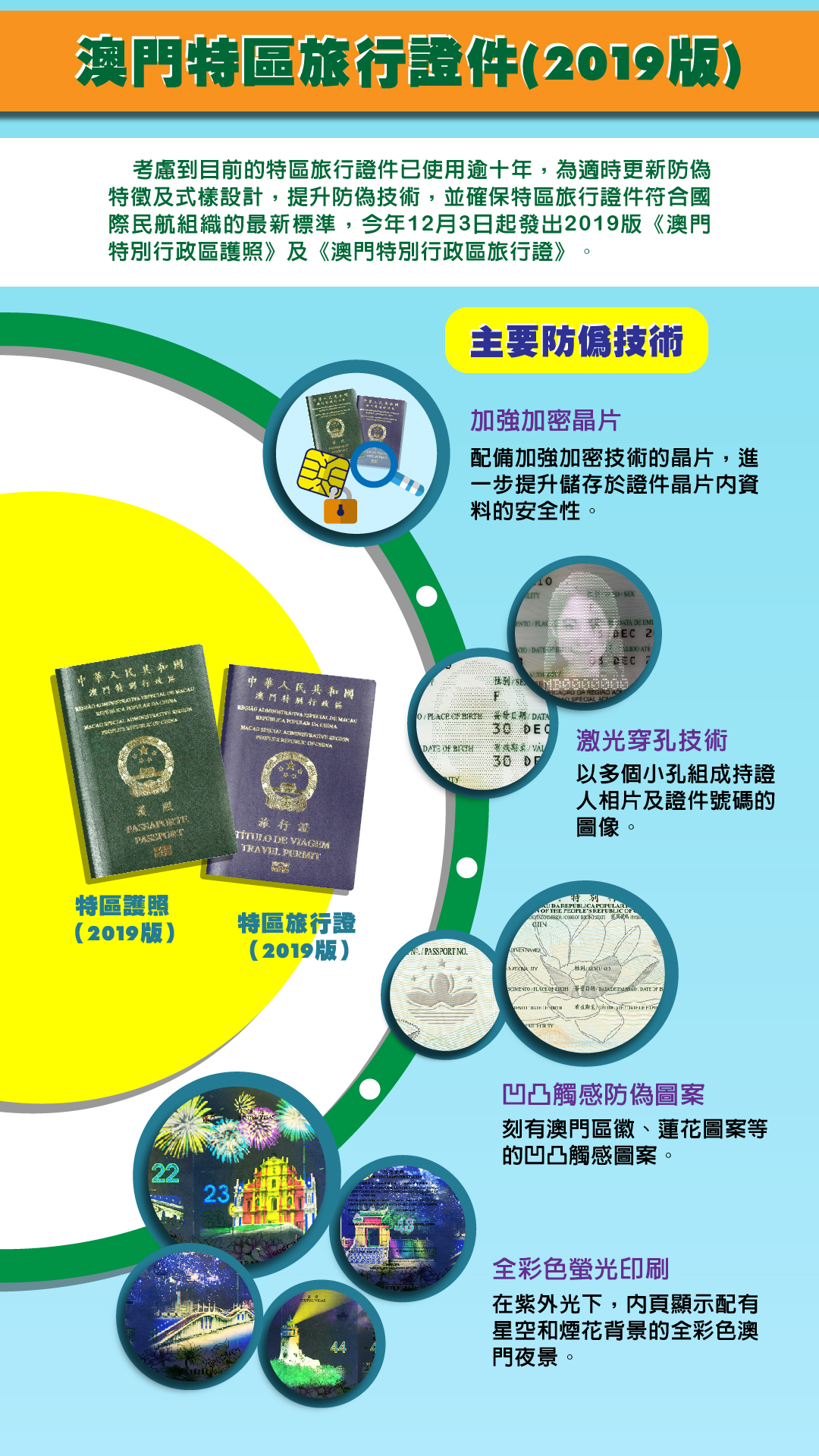 目前的特區旅行證件自二零零九年推出至今已使用近十年,為適時更新防偽特徵及式樣設計,提升防偽技術,並確保特區旅行證件符合國際民航組織的最新標準,身份證明局於今年發出二零一九版特區旅行證件。