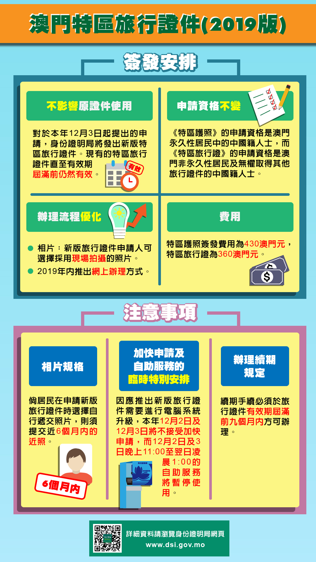 另外,因應推出新版旅行證件需要進行電腦系統升級,本年十二月二日及三日將不接受特區旅行證件的加快申請,而相關自助服務將於十二月二日及三日晚上十一時至翌日凌晨一時暫停服務。居民可於辦證前查閱該局網頁(www.dsi.gov.mo) 或 “澳門身份證明局DSI”官方微信號內的相關資訊,又或致電28370777、28370888查詢。