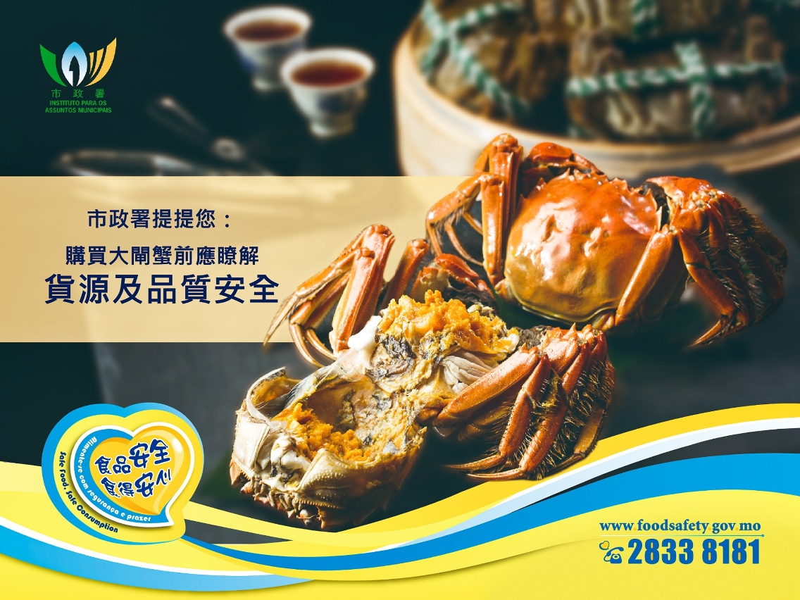 現時本澳市面出售的大閘蟹主要來自內地江蘇、湖南,並且須來自受內地權限部門監管的合資格出口養殖場。為確保供澳大閘蟹的品質及安全,市政署會定期對供澳大閘蟹養殖場進行實地調研,早在大閘蟹養殖階段市政署食品安全廳已派員赴江蘇,實地瞭解當地大閘蟹備案養殖場的環境、水質及飼養管理等,從源頭作品質監控,並與當地海關動植處相關人員,就供澳大閘蟹預檢措施及大閘蟹監管流程進行技術交流。